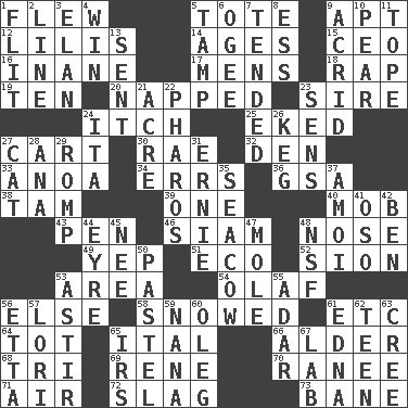 ACROSS 1. Soared 5. Lug 9. Fitting 12. Ms. Damita and namesakes 14. Grows older 15. Corporate head (abbr.) 16. Silly 17. Not women's 18. Hit sharply and swiftly 19. "___ Little Indians" 20. Slept 23. Beget 24. Hankering 25. Made supply last 27. Heavy open wagon 30. Actress Charlotte 32. Lair 33. Small Philippine buffalo 34. Blunders 36. Girls' org. (abbr.) 38. Scottish cap 39. Single 40. Disorderly crowd 43. Writing instrument 46. Thailand, formerly 48. Sense of smell 49. Slangy assent 51. Environmental prefix 52. The Jewish people; Israel 53. Length times width 54. Norwegian king 56. Otherwise 58. Overwhelmed 61. And so on (abbr.) 64. Small child 65. Slanted text style (abbr.) 66. Tree or shrub in the Birch family 68. Three (prefix) 69. French philosopher Descartes 70. Indian princess (variant) 71. Wind 72. Volcanic refuse 73. Object of repulsion DOWN 1. Secret move to avoid paying debts 2. Actor's bit 3. Liveliness 4. Acquire through effort 5. Pack (down) 6. Double curve, resembling the letter S 7. Looked after 8. Double-curved letter 9. Sour-tasting 10. Lightbulb-shaped fruit 11. Drink excessively 13. Emitted 21. 43,560 square feet 22. N Egypt peninsula 23. Elected reps. 24. Call ___ day 26. Cask 27. Feline 28. Santa ___, CA 29. Frolic 31. Bert's buddy 35. Manatee 37. Mine, in Marseilles 41. Bear (Spanish) 42. Benjamin's nick name 44. Jane of fiction 45. Born 47. Undercover agent 48. Science/research agcy. 50. Soft color 53. Moving about 55. The sixth month of the Jewish calendar 56. Singer James 57. Australian parrot (variant) 59. Nanny 60. Cassini of fashion 61. Pulitzer Prize-winning author Ferber 62. Adolescent 63. Algonquian 65. Big collection agency 67. Experiment locale
