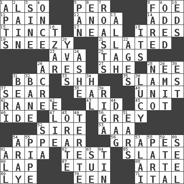 ACROSS 1. In addition 5. For each 8. Enemy 11. Ache 12. Small Philippine buffalo 14. Increase 15. Tinged 17. Anneal 18. Angers 19. Dwarf with a sinus problem 21. Scheduled 23. Actress Gardner 25. Labels 26. Ancient Greek god of war 27. A female animal or person 28. Born 31. English channel? 33. Quiet! 35. Hits or strikes with great force 37. Burn superficially 38. Hearing organ 40. A single undivided whole 41. Indian princess (variant) 43. Hat (slang) 45. Small bed 46. Binary compound 47. Car dealer's back yard 50. Jennifer or Joel 52. The founder of a family 53. Auto club (abbr.) 54. Become visible 56. Raisin fruits 61. Roberta Peters solo 62. Trial 65. Chalkboard 66. Pet locale 67. Needle case 68. Johnson of "Laugh-In" 69. Potassium hydroxide 70. Car or cant ending 71. Slanted text style (abbr.) DOWN 1. Flats, for short 2. (Had) reclined 3. Trig term 4. At one time in the past 5. Baking dish 6. Compass dir. 7. Cooks with dry heat, as in an oven 8. Conductor's collection 9. Wrote a lyric poem 10. Begley and Asner 13. Assad's deity 16. Russian ruler 18. ___ a Wonderful Life 20. Jacques Cousteau's middle name 22. Matures 24. American tennis player Robert 26. Land measure 28. Billionth: prefix 29. Give off 30. Eastern Standard Time (abbr.) 31. Necklace unit 32. Object of repulsion 34. Actor Linden 36. "I Love _" 37. _ Lanka 39. Capital of Latvia 42. Writer Wiesel 44. To draw with force 48. Declaim 49. Cylindrical with tapered ends 51. Hearing organs 52. Health resort 54. Like ___ of sunshine 55. Corncob 57. Jai ____ 58. Component 59. Singer James 60. Stitch closed the eyes of (a falcon) 61. Everything 63. Take to court 64. Metal container