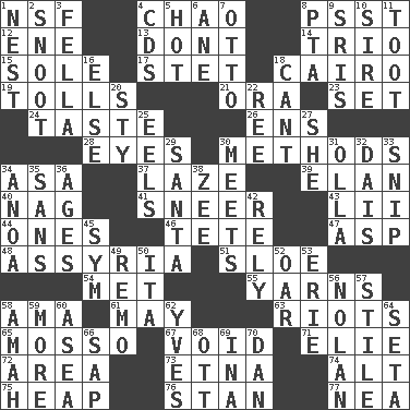 ACROSS 1. Overdraft (abbr.) 4. US Secretary of Labor Elaine L. _ 8. Inconspicuous attention getter 12. Compass dir. 13. Do not 14. Musical group of three 15. Flatfish 17. Proofreading order 18. Capital of Egypt 19. For Whom the Bell _____ 21. Mouth or opening 23. Arrange properly for use 24. Clothes sense 26. Followers of ems 28. Sight organs 30. Modes 34. White ___ sheet 37. Goldbrick 39. Enthusiasm 40. Tired old horse 41. Scornful expression 43. Cards in a Roman deck? 44. Washington bills 46. False hair 47. Cleo's killer 48. Nineveh was its capital 51. _ gin 54. Was introduced to 55. Entertaining tales 58. Nursemaid (var.) 61. Fifth month 63. Disturbances 65. With motion or animation 67. Lacking any legal or binding force 71. Writer Wiesel 72. Type of rug 73. Inactive volcano in Sicily 74. Keyboard modifier key 75. Pile 76. Comedian Laurel of Laurel & Hardy 77. Teachers' org. DOWN 1. A home for chicks 2. Snob 3. Man or boy (slang) 4. Music discs 5. Being at a high temperature 6. A saturated hydrocarbon 7. "Beetle Bailey" pooch 8. Parent Teacher Assoc. 9. Indian titles of respect 10. Title for a man of rank and authority 11. A blast of a horn 16. Otherwise 18. Patter 20. Filthy place 22. To riddle 25. Snakelike fish 27. A female animal or person 29. Before Barbara or Clara 30. Confronts 31. Spanish pot 32. Raised platform 33. Sever or remove by pinching or nipping 34. Small Philippine buffalo 35. Without 36. Ripens 38. Last letter of the English alphabet 42. Have trust in 45. Symbol (abbr.) 49. San ____ (Riviera town) 50. Call ___ day 52. Rowing implement 53. One of the Great Lakes 56. Pitcher Ryan 57. Vertical member of a panel or frame 58. Nursemaid 59. Greater amount 60. Toward the sea 62. Jacques Cousteau's middle name 64. Bristle 66. Plant excrement 68. Baseball player Mel 69. _ tizzy (2 wds.) 70. Daniel's nick name
