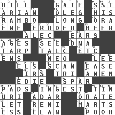 ACROSS 1. Deli pickle 5. Yard entry 9. Fast jet (abbr.) 12. Believer in; advocate of (suffix) 14. Cassini of fashion 15. Part of HMS, perhaps 16. Role for Stallone 17. Having great length 18. Mouth or opening 19. Compass dir. 20. Eaten away 23. Fermented drink made from hops 24. Actor Baldwin 25. Hearing organs 27. Ripens 30. Perceive with the eye 32. Heredity factor (abbr.) 33. Canvas cover 34. Baby powder 36. And so on (abbr.) 38. Followers of ems 39. Modern: prefix 40. Area sheltered from the wind 43. Raised railways 46. Examine minutely or intensely 48. Comfort 49. Big collection agency 51. Three (prefix) 52. So be it 53. Singer Brickell 54. Coast Guard woman 56. Writing tablets 58. Eat 61. Shallow baking pan 64. RI univ. 65. The sixth month of the Jewish calendar 66. Speak pompously 68. Allow 69. Painter Guido (1575-1642) 70. Shops 71. Double-curved letter 72. Liveliness 73. "Silly old bear" DOWN 1. Have the gumption 2. SW Asia republic 3. Citrus frut 4. Experiment locale 5. Gilt 6. Medicinal plant 7. Watched over 8. Ovum 9. Imelda's hoard 10. The founder of a family 11. Russian ruler of old 13. Christmas carol 21. Take ten 22. Seas 23. Naughty child 24. Viper 26. One (Scot) 27. Had dinner 28. Separate the seeds from cotton 29. Celtic language 31. Choose 35. Unrefined 37. Dollar (slang) 41. Compass dir. 42. Car or cant ending 44. Hats (slang) 45. Indian title of respect (Mr.) 47. Pinches, bites 48. Hearing organ 50. A glass for beer 53. Proofreads 55. Tiny particle 56. Whine 57. Ancient Greek god of war 59. Grandmother 60. Smile widely 61. Pacific island yam 62. "Tell ____ the Marines!" 63. Tender 65. "We ___ not amused" (Victoria) 67. Reproach for some lapse or misdeed