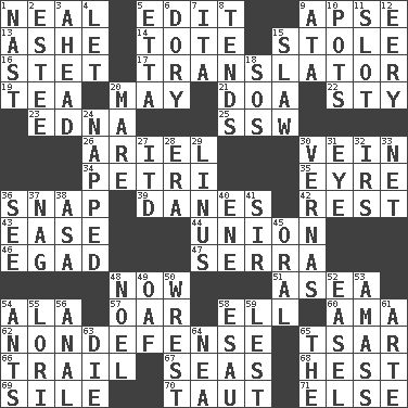 ACROSS 1. Anneal 5. Prepare for publication 9. Domed church section 13. American tennis player Robert 14. Carryall 15. Took without asking 16. Proofreading order 17. Interpreter 19. Afternoon social gathering 20. Can I? 21. ___ good deed 22. Filthy place 23. Pulitzer Prize-winning author Ferber 25. Compass dir. 26. Satellite of Uranus 30. Distinctive style or manner 34. _ dish (used to culture cells) 35. Jane of fiction 36. Fastener 39. Natives or inhabitants of Denmark 42. Respite 43. Comfort 44. The state of being joined or united 46. Mild oath 47. Spanish missionary in California 48. Immediately 51. At sea 54. Chicken ___ king 57. Boat paddle 58. Pipe bend 60. Wet nurse (var.) 62. Unrelated to defense, as in spending 65. Russian ruler of old 66. Go after with the intent to catch 67. Oceans 68. Command 69. Drop; flow; fall 70. Pulled tight 71. Otherwise DOWN 1. Political cartoonist Thomas 2. First name in cosmetics 3. At or in the front 4. Allow 5. Singer James 6. Dinghy 7. Call ___ day 8. Looks after 9. _ moment's notice (2 wds.) 10. Plant holders 11. Groove 12. Suggestive of the supernatural 15. Cole _ (cabbage dish) 18. Distress signal 20. Female horse 24. Slept 27. It would 28. Epoch 29. "_ and Lucy" (Charlie Brown theme song) 30. Actresses Bloom and Felton 31. Sight organ 32. Big collection agency 33. Fish or hair follower 36. Observe 37. Tired old horse 38. White ___ sheet 40. Compass dir. 41. Title for a knight 45. Of the mouth 48. Christmas carol 49. Clumsy lout 50. Obtain by seizing forcibly or violently 52. Artist's stand 53. Collect or gather 54. Pismires 55. Australian parrot (variant) 56. Of or related to the anus 58. He sold his birthright 59. For fear that 61. Johnson of "Laugh-In" 63. Expire 64. Teachers' org. 65. Definite Article