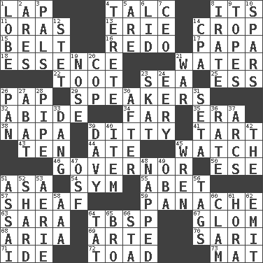 ACROSS 1. Pet locale 4. Baby powder 8. It is 11. Mouths or openings 13. One of the Great Lakes 14. Riding implement 15. Waist strap 16. Make new 17. Dad 18. Core 21. Wetness 22. A blast of a horn 23. Ocean 25. Curvy letter 26. Infant food 29. Orators 32. Stay 34. Distant 35. Epoch 38. California wine valley 39. Simple song 41. Small pie 43. Nine, plus one 44. Had dinner 45. Observe 46. Head of state? 50. Compass dir. 51. White ___ sheet 54. Symbol (abbr.) 55. Collude with 57. Archer's quiver 59. Flamboyance 63. "Two Mules for Sister ____" 64. Cook's measure (abbr.) 67. Take by theft 68. Roberta Peters solo 69. Johnson of "Laugh-In" 70. Indian skirt 71. Binary compound 72. Frog relative 73. Floor covering DOWN 1. Ear part 2. Ancient Greek god of war 3. Friends 4. Cigar-shaped 5. "We ___ not amused" (Victoria) 6. Hat (slang) 7. Corporate head (abbr.) 8. Feeling or showing extreme anger 9. Drinks excessively 10. Practice fights 12. Proofreading order 14. Numbers guy (abbr.) 19. Sense of smell 20. Police officer (slang) 21. Armed conflict 23. Three-handed card game 24. Suggestive of the supernatural 26. Baking dish 27. Blind as ____ 28. Corncob 30. Following 31. Bristle 33. Mild oath, euphamism for damn 36. Assign a rank or rating to 37. Arches 39. American folk hero Crockett 40. A distinct part 42. Definite Article 45. Songbird 47. Order of Saint Francis (abbr.) 48. Slept 49. Chief or king in Benin or Nigeria 51. Slender Brazilian palm 52. Pottery fragment 53. Nest on high 56. Labels 58. American Automobile Association (abbr.) 60. Dollar (slang) 61. Israeli folk dance 62. Give off 64. Make lace 65. Sis' sibling 66. R.R. building
