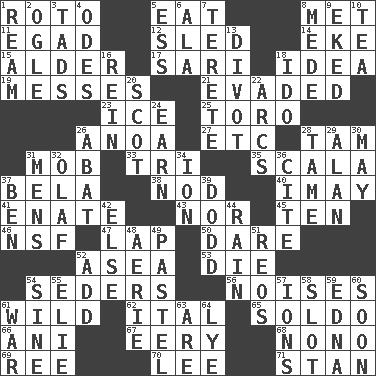 ACROSS 1. Printing process, for short 5. Ingest 8. Was introduced to 11. Mild oath 12. Downhill vehicle 14. Make supply last 15. Tree or shrub in the Birch family 17. Indian skirt 18. It may be bright or harebrained 19. Makes clutter 21. Eluded 23. Frozen water 25. "Corrida" creature 26. Small Philippine buffalo 27. And so on (abbr.) 28. Scottish cap 31. Crowd into 33. Three (prefix) 35. Any of the three canals of the cochlea 37. Actor Lugosi 38. Dreamland 40. "If ____ say so..." 41. Related on the mother's side 43. And not 45. "___ Little Indians" 46. Science/research agcy. 47. Infant locale 50. Have the gumption 52. Toward the sea 53. Expire 54. Spring feasts 56. Annoying sounds 61. Rampant 62. Slanted text style (abbr.) 65. Twentieth part of a lira 66. Black tropical American cuckoo 67. Suggestive of the supernatural 68. Words to Nanette 69. To riddle 70. Area sheltered from the wind 71. Comedian Laurel of Laurel & Hardy DOWN 1. 480, 500 or 516 sheets of paper 2. Stare 3. Bits 4. Lyric poems 5. Curvy letter 6. Chicken ___ king 7. Cylindrical with tapered ends 8. Ancient Persian 9. Made supply last 10. Afternoon social gathering 13. A piece of turf (Scot.) 16. It's straight from the horse's mouth 18. Wedding promise 20. Highlander 22. Curves 24. Merit 26. Blind as ____ 28. Docile 29. Actor Alda or Thicke 30. Can I? 31. Not women's 32. Norwegian king 34. Electrically charged atom 36. Quote 37. Benjamin's nick name 39. Texas town _ City 42. Otherwise 44. Water falling in drops from the sky 48. Nest on high 49. Soft color 51. Vintage cars 52. Say or write further 54. Trig term 55. Writer Wiesel 57. Charged particles 58. Slit 59. Pulitzer Prize-winning author Ferber 60. Within a short period 61. Armed conflict 63. "We ___ not amused" (Victoria) 64. Potassium hydroxide