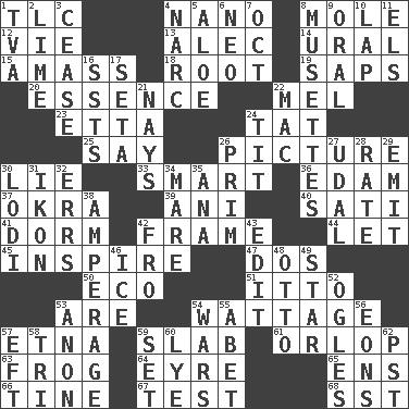 ACROSS 1. Affectionate concern, for short 4. Billionth: prefix 8. Undercover agent 12. Compete 13. Actor Baldwin 14. Mountain range 15. Collect or gather 18. Carrot, for example 19. Plant excrements 20. Core 22. Cartoonist voice _ Blanc 23. Singer James 24. Make lace 25. Declare 26. Photo 30. Whopper 33. Don Adams' spy role 36. Dutch treat 37. Gumbo ingredient 39. Cuckoo 40. Suttee (variant) 41. Dormintory (informal) 42. Movie unit 44. Allow 45. Stimulate to action 47. Two (Sp.) 50. Environmental prefix 51. "Tell ____ the Marines!" 53. "We ___ not amused" (Victoria) 54. Electrical Measurement 57. Inactive volcano in Sicily 59. Broad, flat, thick piece 61. Fourth or lowest deck 63. Toadlike animal 64. Jane of fiction 65. Followers of ems 66. Prong on a fork 67. Trial 68. Fast jet (abbr.) DOWN 1. Federal power corp. 2. Citrus frut 3. Stop 4. Drug cop 5. Medicinal plant 6. Modern: prefix 7. Sep. follower 8. French bagpipes 9. Relating to the mouth 10. Infant locale 11. Raised railways 16. Fast planes 17. Bristle 21. Negative votes 22. Apple computer (short form) 24. Teat (slang) 26. Demure 27. Hereditary estate 28. Pace 29. Give off 30. Farming town in central California 31. Image 32. Blunders 34. Female horse 35. Santa ___, CA 38. Electrical Measurement 42. Back 43. Prepare for publication 46. Frozen water 48. Von Bismarck 49. Play the lead 52. Stares at amorously 53. Soon (poet.) 54. Armed conflicts 55. Collude with 56. Immeasurably long periods of time 57. Bank Draft (abbr.) 58. Three (prefix) 59. Put into a specified state 60. Potassium hydroxide 62. Pacific Standard Time (abbr.)