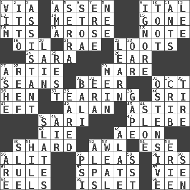 ACROSS 1. By way of 4. NE Netherlands city 9. Slanted text style (abbr.) 13. ___ a Wonderful Life 14. Distance measurement (Brit.) 15. Went 16. Mountains (abbr.) 17. Came up 18. Brief written record 19. Lubricate 21. Actress Charlotte 22. Plunders 24. "Two Mules for Sister ____" 26. Hearing organ 27. Nick name for Arthur 29. Female horse 30. Actors Connery and Penn 31. Fermented drink made from hops 33. Sep. follower 36. Layer 37. Lacerating 40. Indian title of respect (Mr.) 41. Lizard (obsolete) 42. Actor Alda or Thicke 43. Being in motion 45. Indian skirt 47. Cadet 48. Untruth 49. Period of immesurable duration 50. Pottery fragment 52. Leather borer 54. Compass dir. 56. Set down 57. Entreaties 59. Big collection agency 61. Governing power 62. Arguments over trivial matters 63. Compete 64. Snakelike fish 65. Small island 66. Car or cant ending DOWN 1. Zeal 2. "Tell ____ the Marines!" 3. Helper 4. Wet nurse (var.) 5. Father Junipero _ 6. Portico 7. Celtic language 8. Born 9. Disregard 10. A blast of a horn 11. Pismires 12. Area sheltered from the wind 20. (Had) reclined 22. Acquire or gain knowledge or skills 23. Rowing implement 25. Take ten 27. American tennis player Robert 28. Coral collection 29. Count _ (2 wds.) 31. Indonesian resort city 32. Period 33. Clearly or manifestly demonstrative 34. Baby bed with high sides 35. Hoop that covers a wheel 38. Having ears or earlike features 39. Yawn 44. A type of plum 45. Chalkboards 46. Wind 49. Having winglike extensions 50. Change direction abruptly 51. Land elevation 52. High mountains 53. Welt 55. 4th largest of the Great Lakes 56. "We ___ not amused" (Victoria) 57. 23rd letter of the Greek alphabet 58. Fast jet (abbr.) 60. Elected rep.