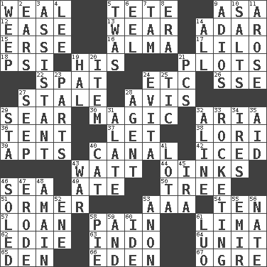 ACROSS 1. Welt 5. Wig 9. White ___ sheet 12. Relaxation 13. Erode 14. The sixth month of the Jewish calendar 15. Celtic language 16. _ mater 17. _ and Stitch 18. Air pressure measure (abbr.) 19. Part of HMS, perhaps 21. Schemes 22. Argument over a trivial matter 24. And so on (abbr.) 26. Compass dir. 27. Lacking originality or spontaneity 28. Advice 29. Wither 30. Mysterious quality of enchantment 32. Roberta Peters solo 36. Portable shelter 37. Allow 38. Australian parrot (variant) 39. Tenement units (abbr.) 40. Lessep's creation 42. On the rocks 43. Electrical Unit 44. Pig sounds 46. Ocean 49. Had dinner 50. Family _ (genealogy) 51. Abalone 53. Auto club (abbr.) 54. Nine, plus one 57. Grant temporary use of 58. Ache 61. Pale green bean 62. Singer Brickell 63. Southeast Asian peninsula 64. A single undivided whole 65. Lair 66. Paradise 67. Legendary monster DOWN 1. Shed a tear 2. Hearing organs 3. Aide 4. Area sheltered from the wind 5. It was, poetically 6. Snakelike fish 7. Scottish cap 8. Period 9. Goodbye (Sp.) 10. Table seasonings 11. Came up 14. Everything 19. Actor Linden 20. Detail 21. Personal Computers (abbr.) 23. Components 24. Webber/Rice musical 25. Nervous spasm 27. Ooze 28. Rep 29. R.R. building 31. Having winglike extensions 32. Place in a line 33. Shooting up abruptly 34. Angers 35. Help 40. Domesticated feline 41. Globular water bottle used in Asia 43. Armed conflict 45. Lyricist Gershwin 46. Having a sole or soles 47. Eat (away) 48. At full speed 52. Compass dir. 53. Soon (poet.) 55. Arab leader 56. Nathan's nickname 58. Sliced dessert 59. Added to 60. Binary compound 61. Nilotic language