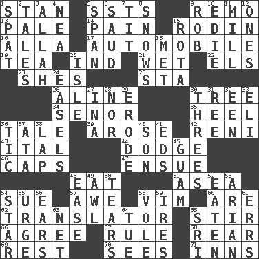 ACROSS 1. Comedian Laurel of Laurel & Hardy 5. Fast planes 9. San ____ (Riviera town) 13. Light colored 14. Ache 15. "The Thinker" sculptor 16. Silent film actress Nazimova 17. Form of transportation 19. Afternoon social gathering 20. Working for oneself (abbr.) 21. Dripping 22. Raised railways 23. "______ My Girl" (Turtles hit) 25. R.R. building 26. Place in a line 30. Family _ (genealogy) 34. Sir (Sp.) 35. Person who is morally reprehensible 36. Falsehood 39. Came up 42. Painter Guido (1575-1642) 43. Slanted text style (abbr.) 44. Evade 46. Balmoral and tarboosh 47. Take place subsequently 48. Consume 51. At sea 54. Take to court 57. Deep reverence 58. Zeal 60. "We ___ not amused" (Victoria) 62. Interpreter 65. Use a swizzle stick 66. Match 67. Governing power 68. Stern 69. Respite 70. Observes 71. Taverns DOWN 1. Argument over a trivial matter 2. Stories 3. Assad's deity 4. Teachers' org. 5. Connect, as a bridge 6. Saudi Arabian king (1953-1964) 7. Teat (slang) 8. Frozen precipitation (plural) 9. Director Reiner 10. Singer Brickell 11. Place where flour is made 12. Singles 15. Roll call or roster of names 18. Was introduced to 20. Small island 24. Artist's stands 27. _ tizzy (2 wds.) 28. Not either 29. Wear away 30. Threesomes 31. Portuguese money of account (variant) 32. Car or cant ending 33. Biblical high priest 36. Nervous spasm 37. _ moment's notice (2 wds.) 38. Pet locale 40. Male child 41. Begley and Asner 45. Island territory of the United States 48. Relaxation 49. Leather borer 50. Lacerates 52. Ingested 53. Believer in; advocate of (suffix) 54. Play the lead 55. Goad 56. Hearing organs 58. Short-tailed, large-bodied rat 59. Angers 61. Blunders 63. Fish or hair follower 64. Third day of the wk. 65. Indian title of respect (Mr.)