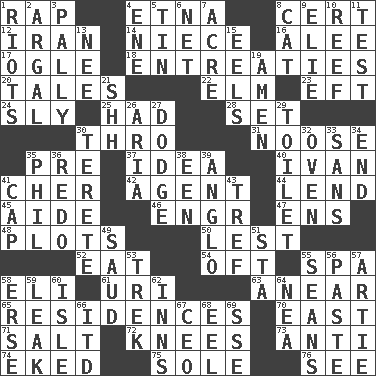 ACROSS 1. Hit sharply and swiftly 4. Inactive volcano in Sicily 8. An absolute certainty 12. SW Asia republic 14. Sibling's daughter 16. Toward shelter 17. Stare 18. Pleas 20. Stories 22. Shade tree 23. Lizard (obsolete) 24. Wily 25. Possessed 28. Put into a specified state 30. Through, poetically 31. Trap for birds or small mammals 35. Before (prefix) 37. The main thing one is thinking about 40. _ the terrible 41. "Mermaids" star 42. Representative 44. Grant temporary use of 45. Assistant 46. Engineer (abbr.) 47. Followers of ems 48. Small pieces of grounds 50. For fear that 52. Ingest 54. Often (poetically) 55. Health resort 58. Connecticut Ivy Leaguer 61. RI univ. 63. Approach 65. Homes 70. Compass direction 71. Table seasoning 72. Leg joints 73. Against 74. Made supply last 75. Flatfish 76. Perceive with the eye DOWN 1. Disturbances 2. Therefore, facetiously 3. Chummy 4. Compass dir. 5. Metal container 6. Fish or hair follower 7. 1/640 square mile 8. Feline 9. Writer Wiesel 10. Coral collection 11. Trial 13. Born 15. Snakelike fish 19. So be it 21. Quiet! 26. Operatic vocal solo 27. Evade 29. Bathroom plumbing fixture 30. Cylindrical with tapered ends 32. Baking chamber 33. Without 34. Conclude 35. Silvers or Donahue 36. Redecorate 38. Car or cant ending 39. White American of non-Hispanic descent 41. Head covering 43. Not kosher 49. Saudi Arabian king (1953-1964) 51. R.R. building 53. Long journey 55. Seines 56. Thick mixture 57. Nick name for Arthur 58. Celtic language 59. Path through which fluid escapes 60. Small island 62. Lodging establishments 64. Teachers' org. 66. It would 67. Corporate head (abbr.) 68. Snakelike fish 69. Compass dir.
