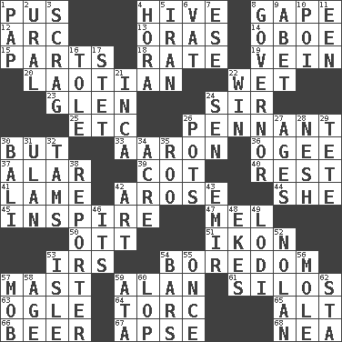 ACROSS 1. Product of festering 4. Hub of activity 8. Yawn 12. Curve 13. Mouths or openings 14. Mitch Miller's instrument 15. Components 18. Assign a rank or rating to 19. Distinctive style or manner 20. Of or relating to Laos or its people 22. Dripping 23. Small, secluded valley 24. Title for a knight 25. And so on (abbr.) 26. Pre-World Series prize 30. On the contrary 33. Composer Copland 36. Double curve, resembling the letter S 37. Having or resembling wings 39. Small bed 40. Respite 41. Unable to walk 42. Came up 44. A female animal or person 45. Motivate 47. Cartoonist voice _ Blanc 50. Baseball player Mel 51. Visual representation of an object 53. Big collection agency 54. Mood resulting from idleness 57. Vertical spar for supporting sails 59. Actor Alda or Thicke 61. Grain storage towers 63. Stare at amorously 64. Torque (variant) 65. Keyboard modifier key 66. Fermented drink made from hops 67. Domed church section 68. Teachers' org. DOWN 1. Infant food 2. Mountain range 3. Strangle with an iron collar 4. Israeli folk dance 5. SW Asia republic 6. Large container 7. Compass dir. 8. Head of state? 9. Collude with 10. Luau course 11. Car or cant ending 16. Lacquered or enameled metalware 17. Proofreading order 21. South American Indian 22. Victory 24. Elected rep. 26. Plant holders 27. Eras 28. Tender 29. False hair 30. Indonesian resort city 31. Uhlan (variant) 32. Scottish caps 34. 1/640 square mile 35. Friend of Pooh 38. News announcer 42. Tate display 43. Arab leader 46. ___ a Wonderful Life 48. Makes supply last 49. Farming town in central California 52. Pitcher Ryan 53. Capri or Wight 54. Soap units 55. At one time in the past 56. Undercover agent 57. Disorderly crowd 58. Personal question 59. "One Day ___ Time" 60. Trim (branches) 62. R.R. building