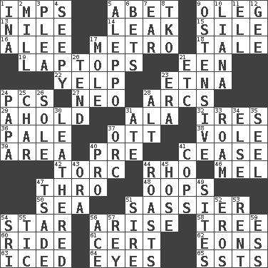 ACROSS 1. Naughty children 5. Collude with 9. Cassini of fashion 13. "Death on the ____" 14. Path through which fluid escapes 15. Drop; flow; fall 16. Toward shelter 17. Paris' subway 18. Story 19. Portable computers 21. Car or cant ending 22. Sharp bark 23. Inactive volcano in Sicily 24. Personal Computers (abbr.) 27. Modern: prefix 28. Arches 29. Hold, grip (Informal) 31. According to 32. Angers 36. Light colored 37. Baseball player Mel 38. Grand slam 39. Length times width 40. Before (prefix) 41. Desist 42. Torque (variant) 44. 17th letter of the Greek alphabet 46. Cartoonist voice _ Blanc 47. Through, poetically 48. I made a mistake 50. Ocean 51. More impudent 54. Play the lead 56. Get up 58. Woody plant 60. Travel on an animal 61. Certainty 62. Immeasurably long periods of time 63. On the rocks 64. Sight organs 65. Fast planes DOWN 1. _ tizzy (2 wds.) 2. Place where flour is made 3. Entreaty 4. Not well drained, as in land 5. City in Syria 6. Antes 7. Hearing organ 8. Ring climax 9. Clearly or manifestly demonstrative 10. Climbing, woody, usually tropical vines 11. Pipe bend 12. Unit of force equal to gravity 17. Undercover agent 20. Look after 21. And so on (abbr.) 23. Epoch 24. Dad 25. Burn to charcoal 26. Not divided or shared with others 28. The first octave above the treble staff 30. Resembling or made to resemble leather 31. Had dinner 33. Wander aimlessly 34. Otherwise 35. Stitch closed the eyes of (a falcon) 37. The grampus (Milton) 40. Adept person 41. 911 reaches them 43. Mouth or opening 44. Cooks with dry heat, as in an oven 45. Stockings 47. Sadhe (variant) 49. Settings 51. Beget 52. Greek god of love 53. Monthly bill 54. _ Lanka 55. Nervous spasm 56. Adept person 57. Marina Del _, California 59. Double-curved letter