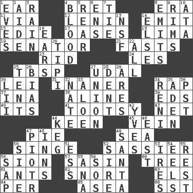 ACROSS 1. Ewer handle 4. Cy Young winner Saberhagen 8. Epoch 11. By way of 12. Soviet premier 1918-24 14. Send forth 15. Singer Brickell 17. Fertile tracts in a desert 18. Pale green bean 19. Legislator 21. Goes without food and/or water 23. To free from 24. French article 25. Cook's measure (abbr.) 27. Hereditary estate 30. Luau accessory 31. More empty; more void 34. Hit sharply and swiftly 37. _ tizzy (2 wds.) 38. Place in a line 39. Begley and Asner 40. It is 41. Tootsie (variant) 43. Fish or hair follower 44. Peachy ____! 45. Distinctive style or manner 47. Sliced dessert 49. Ocean 50. Scorch 52. More lively and spirited 56. The Jewish people; Israel 57. Indian antelope 60. Relationship diagram 61. Pismires 62. Derisive sound 63. Raised railways 64. For each 65. At sea 66. Fast jet (abbr.) DOWN 1. Nights before holidays 2. Assistant 3. Precipitation 4. Vital fluid 5. Located in or toward the back 6. Followers of ems 7. Make a knot 8. Gives off 9. Basketball hoops 10. _ moment's notice (2 wds.) 13. Science/research agcy. 14. Otherwise 16. Hearing organs 20. Native american tent (variation) 22. Everything 25. Portable shelter 26. Prejudice 27. The state of being joined or united 28. Gouge 29. Ancient Greek god of war 30. Cards in a Roman deck? 32. Nathan's nickname 33. Medicinal plant 34. Painter Guido (1575-1642) 35. Arabian gulf 36. Pacific Standard Time (abbr.) 42. Jacques Cousteau's middle name 44. Barrel 46. Compass direction 47. Peter (Polish) 48. Taverns 49. Before Barbara or Clara 50. Trig term 51. Double-curved letter 52. Father 53. Angers 54. Snakelike fish 55. State of inaction 56. Plant excrement 58. Santa ___, CA 59. Distress signal