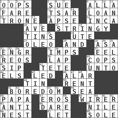 ACROSS 1. I made a mistake 5. Institute legal proceedings 8. Silent film actress Nazimova 12. Conductor's collection 13. Russian ruler of old 15. Grant temporary use of 16. Marketplace scale 18. Domed church section 19. South American Indian 20. "___ Maria" 22. Slender, wiry 24. Airtight sealed metal containers 26. Shoshoni 27. Butter sub 28. Added to 29. White ___ sheet 32. Engineer (abbr.) 35. Naughty children 37. Snakelike fish 38. Vintage cars 39. Pet locale 40. 911 reaches them 41. Small drink 42. Wig 43. To (old English) 44. Raised railways 45. Directed 46. Having or resembling wings 49. Metal container 50. Monthly bill 51. Mood resulting from idleness 55. Ocean 56. Dad 57. Greek god of love 59. One who wires 63. Opposed to 64. Have the gumption 65. Mediterranean tributary 66. Egg locale 67. Allow 68. Not divided or shared with others DOWN 1. Often (poetically) 2. Boat paddle 3. Adept person 4. Legislators 5. R.R. building 6. United States Postal Service (abbr.) 7. Compass direction 8. Place in a line 9. Protracted 10. Made of lace 11. Santa ___, CA 14. Summer TV shows 17. Morally bad or wrong 21. Compass dir. 23. It would 25. Dirtied 28. Become visible 29. Period of immesurable duration 30. Back-to-school mo. 31. In addition 32. Celtic language 33. Famous astronaut Armstrong 34. Republicans 36. Floor protector 40. Window treatments 42. Looked after 45. Untruth 47. French article 48. Afresh 49. Distinguishing feature 51. Object of repulsion 52. Elects 53. Taken by mouth 54. Greater amount 56. Baking dish 58. Arrange properly for use 60. _ de Janeiro 61. Pipe bend 62. Portuguese money of account (variant)