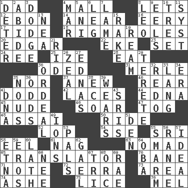 ACROSS 1. June honoree 4. Shopping center 8. Allows 12. Inky black, to poets 14. Approach 16. Suggestive of the supernatural 17. Periodic rise and fall of the sea level 18. Frustrating wastes of time 20. _ Allan Poe 22. Make supply last 23. Put into a specified state 24. To riddle 25. Ending with capital 28. Erode 30. Wrote a lyric poem 31. Haggard of country music 35. Not either 37. Afresh 40. Located in or toward the back 41. Texas town _ City 42. Shoestrings 44. Pulitzer Prize-winning author Ferber 45. Naked 46. Fly high 47. Coat; cloak 48. Slender Brazilian palm 50. Travel on an animal 52. Trim (branches) 54. Compass dir. 55. Indian title of respect (Mr.) 58. Snakelike fish 61. Tired old horse 63. Wanderer 65. Interpreter 70. Object of repulsion 71. Short letter 72. Father Junipero _ 73. Type of rug 74. American tennis player Robert 75. Louse (plural) 76. Cartoonist voice _ Blanc DOWN 1. Prevent from occurring 2. Stay 3. Evade 4. Impair 5. Cuckoo 6. Part of a journey 7. Unable to walk 8. Lion 9. Snakelike fish 10. Woody plant 11. System (abbr.) 13. Teachers' org. 15. Immoral or dissolute person 19. 480, 500 or 516 sheets of paper 21. To free from 26. Ardor 27. Ferber et al. 29. Cigar-shaped 30. Severe or trying experience 32. Redecorate 33. Long (Scottish) 34. Period 35. Common sense 36. Probability 38. Environmental prefix 39. Puts on (as clothing) 41. Heredity factor (abbr.) 43. Indian titles of respect 49. Charged particles 51. Lair 53. Friends 55. Excessive but superficial compliments 56. Indian princess (variant) 57. Standard of perfection 58. Inactive volcano in Sicily 59. Greek god of love 60. Thin strip of wood or metal 62. Highlander 64. Chief or king in Benin or Nigeria 66. Born 67. Three (prefix) 68. The grampus (Milton) 69. Actress Charlotte