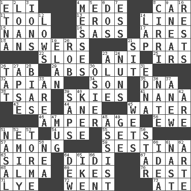 ACROSS 1. Biblical high priest 4. Ancient Persian 8. 4-wheeled motor vehicle 11. Instrument 13. Greek god of love 14. Actor's bit 15. Billionth: prefix 16. Backtalk 17. Ancient Greek god of war 18. Responses 21. Small fatty European fish 22. _ gin 23. Cuckoo 25. Big collection agency 26. Keyboard key 29. Utter; complete 32. Bee-related 34. Male child 35. Heredity factor (abbr.) 38. Russian ruler of old 39. Atmospheres 41. Nanny 43. Compass dir. 44. One (Scot) 45. Wetness 46. Electrical Measurement 50. She-sheep 51. Remaining after all deductions 54. Purpose 55. Arranges properly for use 57. Amid 59. French poetic form 63. Male parent of an animal 64. "You Light Up My Life" star Conn 67. The sixth month of the Jewish calendar 68. _ mater 69. Supplements with great effort 70. Respite 71. Sodium hydroxide 72. Gone 73. Had dinner DOWN 1. Inactive volcano in Sicily 2. Grant temporary use of 3. Charged atoms 4. Makes clutter 5. Epoch 6. Two (Sp.) 7. Curvy letter 8. High-altitude cloud 9. Approach 10. Musical pauses 12. Coldest temperatures 14. Pet locale 19. Flair 20. Director Reiner 21. Be seated 23. Medicinal plant 24. Religious women 26. Make lace 27. Domed church section 28. Prejudice 30. Flexible twig of a willow tree 31. Pulitzer Prize-winning author Ferber 33. Type of rug 36. Nathan's nickname 37. Afresh 39. Plant excrements 40. Leg joint 42. "We ___ not amused" (Victoria) 45. Moistens 47. Large cup 48. Aid 49. Turn to the right 51. Relating to the nose 52. Poet Dickinson 53. Singer Mel 56. Play the lead 58. Teachers' org. 60. The main thing one is thinking about 61. Political cartoonist Thomas 62. Johnson of "Laugh-In" 64. Morning condensation 65. Mamie's husband 66. Lair