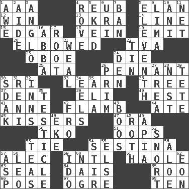 ACROSS 1. American Automobile Association (abbr.) 4. Reuben's nickname 8. Flair 12. Victory 13. Gumbo ingredient 14. Actor's bit 15. _ Allan Poe 18. Distinctive style or manner 19. Give off 20. Shoved, as through a crowd 22. Federal power corp. 23. Mitch Miller's instrument 24. Expire 25. _ moment's notice (2 wds.) 26. Pre-World Series prize 30. Indian title of respect (Mr.) 33. Memorize 36. Relationship diagram 37. Undesirable depression on a surface 39. Biblical high priest 40. Command 41. Queen of England 1702-14 42. Flambe (short form) 44. Had dinner 45. Smoochers 47. Mouth or opening 50. Ring climax 51. I made a mistake 53. Neckwear 54. French poetic form 57. Actor Baldwin 59. International (abbr.) 61. White Person, in Hawaii 63. Lick closed 64. Raised platform 65. Friend of Pooh 66. Airs 67. Legendary monster 68. "___ Little Indians" DOWN 1. Deep reverence 2. Helper 3. White American of non-Hispanic descent 4. Be footloose 5. Supplemented with great effort 6. RI univ. 7. Bar 8. Veterans Day date 9. Pale green bean 10. Cuckoo 11. Fish or hair follower 16. Swedish rock group 17. Carrot, for example 21. Welt 22. Shallow baking pan 24. Lair 26. Demure 27. Length times width 28. A home for chicks 29. False hair 30. Neighbor of Neb. 31. Painter Guido (1575-1642) 32. Taverns 34. Snakelike fish 35. In the manner of 38. A testis 42. From 43. Expressions of contempt or scorn 46. Supplement with great effort 48. Writer of Portnoy's Complaint (1969) 49. Capital of Western Samoa 52. Derisive sound 53. Afternoon social gatherings 54. Use a spoon 55. Otherwise 56. _ vera 57. Viper 58. Lion 59. Wedding promise 60. Tired old horse 62. Period of immesurable duration