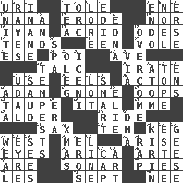ACROSS 1. RI univ. 4. Lacquered or enameled metalware 8. Compass dir. 11. Grandmother 13. Wear away 15. Not either 16. _ the terrible 17. Bitter 18. Lyric poems 19. Looks after 21. Car or cant ending 22. Short-tailed, large-bodied rat 23. Compass dir. 24. Luau course 27. "___ Maria" 29. Baby powder 30. Feeling or showing extreme anger 34. Purpose 36. Snakelike fish 39. 13-14th century defensive garment 40. First of billions? 41. Dwarf 43. I made a mistake 44. Grayish beige 46. Slanted text style (abbr.) 47. Madame (abbr.) 48. Tree or shrub in the Birch family 49. Travel on an animal 51. Saxophone 53. Nine, plus one 54. Barrel 57. 270 degrees 60. Cartoonist voice _ Blanc 63. Ascend 65. Snake ____ (dice throw) 66. N. Chile seaport 69. Johnson of "Laugh-In" 70. "We ___ not amused" (Victoria) 71. Echolocation 72. Sliced desserts 73. French article 74. Back-to-school mo. 75. Born DOWN 1. Join together 2. All-night dance parties 3. Empty; void 4. Beverage made from leaves 5. The grampus (Milton) 6. Old wives' tales, e.g. 7. Singer Brickell 8. Inside; within (prefix) 9. Christmas carol 10. Celtic language 12. Plus 14. Pulitzer Prize-winning author Ferber 18. Conquer 20. Health resort 25. Cassini of fashion 26. Ancient Celtic tribe of eastern Britain 28. By way of 29. Storms 31. Smallest unit of an element 32. Drink excessively 33. Followers of ems 34. Hereditary estate 35. Saudi Arabian king (1953-1964) 37. Car dealer's back yard 38. Don Adams' spy role 40. "One Day ___ Time" 42. Writer Wiesel 45. Period 50. Heredity factor (abbr.) 52. Dec. holiday 54. Japanese brewing company 55. First name in cosmetics 56. Honkers 57. Welt 58. Jane of fiction 59. Perceives with the eye 61. Greek god of love 62. Actor's bit 64. Strike 67. Head covering 68. Nonscientific branch of learning