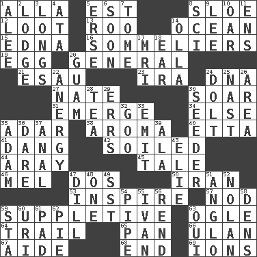 ACROSS 1. Silent film actress Nazimova 5. Eastern Standard Time (abbr.) 8. A type of plum 12. Plunder 13. Friend of Pooh 14. Sea 15. Pulitzer Prize-winning author Ferber 16. Wine waiters 19. Oval reproductive body of a fowl 20. Commissioned military rank 21. Son of Isaac 23. Lyricist Gershwin 24. Heredity factor (abbr.) 27. Nathan's nickname 30. Fly high 31. Develop 34. Otherwise 35. The sixth month of the Jewish calendar 38. Scent 40. Singer James 41. Mild oath, euphamism for damn 42. Dirtied 44. Like ___ of sunshine 45. Story 46. Cartoonist voice _ Blanc 47. Two (Sp.) 50. SW Asia republic 53. Motivate 57. Lower and raise head in agreement 59. Supplying deficiencies 63. Stare at amorously 64. Drop behind 65. Baking dish 66. ____ Bator 67. Helper 68. Conclusion 69. Charged atoms DOWN 1. Toward shelter 2. Cabin 3. Yearns 4. "One Day ___ Time" 5. Celtic language 6. Within a short period 7. Heavy book 8. _-fi 9. Area sheltered from the wind 10. Rowing implement 11. Followers of ems 14. Water jar 17. Medical imaging device (abbr.) 18. Ewer handle 20. Island territory of the United States 22. Disorder of the immune system 24. Stupid person 25. Political cartoonist Thomas 26. Type of rug 28. Afternoon social gathering 29. Blunders 30. Sowing specialist 32. Thick or sticky substance 33. Send forth 35. First of billions? 36. Have the gumption 37. Of or related to the anus 39. Wing 43. Writer Wiesel 47. Deli pickle 48. Single 49. Fast jet (abbr.) 51. White American of non-Hispanic descent 52. Pitcher Ryan 54. Corncob 55. _ the terrible 56. Tear apart 58. Lairs 59. R.R. building 60. RI univ. 61. Writing tablet 62. Sliced dessert 63. Fr. "Yes"