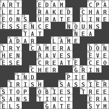 ACROSS 1. Nonscientific branch of learning 4. Dutch treat 8. Accounting whiz (abbr.) 11. Luau accessory 12. Moved through 14. Burn to charcoal 15. Immeasurably long periods of time 17. A salt of uric acid 18. Actor's bit 19. Substance 21. Parts of speech 23. Make lace 24. Teachers' org. 25. The sixth month of the Jewish calendar 27. Unable to walk 30. Attempt 31. Device for capturing images 34. Spanish title 37. Layer 38. All-night dance parties 39. First lady 40. Compass dir. 41. Cause to be 43. Corporate head (abbr.) 44. "Mermaids" star 45. Amused look 47. Indiana (abbr.) 49. Sliced dessert 50. From or relating to Ireland 52. More disrespectful 56. Discontinue 57. Off-Broadway awards 60. Family _ (genealogy) 61. Without 62. Tinged 63. Epoch 64. Raised railways 65. Yard entry 66. Symbol (abbr.) DOWN 1. Toward shelter 2. Vintage cars 3. Airtight sealed metal containers 4. Spew [out] 5. Have the gumption 6. Alias (abbr.) 7. Was introduced to 8. Large country 9. Zero-star reviews 10. "We ___ not amused" (Victoria) 13. Lair 14. A slight indication 16. Stalk of a moss capsule 20. Drug cop 22. Single 25. Ancient Greek god of war 26. Unit of force 27. Crowbar 28. Length times width 29. Vertical spar for supporting sails 30. Definite Article 32. Bowlike part 33. Female horse 34. Tenth: prefix 35. Baking chamber 36. Modern: prefix 42. Armor plate that protects the chest 44. Music discs 46. Take ten 47. Removes the wrinkles 48. Cuts off 49. Thick mixture 50. Slanted text style (abbr.) 51. Being at a high temperature 52. Religious group 53. Angers 54. Suggestive of the supernatural 55. 480, 500 or 516 sheets of paper 56. Compass dir. 58. Massive 59. _ tizzy (2 wds.)
