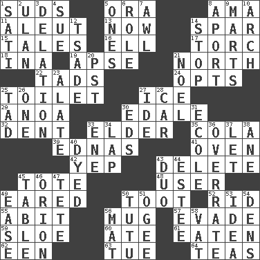 ACROSS 1. Soap bubbles 5. Mouth or opening 8. Nanny (var.) 11. Native American of Southwest Alaska 13. Immediately 14. Practice fight 15. Lies 16. Pipe bend 17. Torque (variant) 18. _ tizzy (2 wds.) 19. Domed church section 21. 0 degrees 22. Small boys 24. Chooses 25. Rest room 27. Frozen water 29. Small Philippine buffalo 30. Peak District village in England 32. Undesirable depression on a surface 33. A person who is older than you are 35. Root beer relative 39. Ferber et al. 41. Baking chamber 42. Slangy assent 43. Erase 45. Carry 48. One who makes use of a thing 49. Having ears or earlike features 50. A blast of a horn 52. To free from 55. "This won't hurt ____!" 56. Large cup 57. Elude 59. A type of plum 60. Had dinner 61. Consumed 62. Car or cant ending 63. Third day of the wk. 64. Afternoon social gatherings DOWN 1. Suttee (variant) 2. ____ Bator 3. Conveyance 4. Take to court 5. Washington bills 6. Hero or heavy, e.g. 7. Leather borer 8. To the left, to Queeg 9. Shops 10. Bowlike part 12. Sadhe (variant) 14. Constrict 20. Pacific Standard Time (abbr.) 21. Christmas carol 23. Having winglike extensions 25. Bit 26. Single 27. Binary compound 28. Auto 30. Begley and Asner 31. Learning spot: Fr. 33. Compass dir. 34. Infant locale 36. Make much ado about nothing 37. Allow 38. A saturated hydrocarbon 40. Colored 43. Superhero pair 44. First name in cosmetics 45. Eating place 46. Greek mythologigal hunter 47. False hair 49. Relaxation 50. Ballerina skirt 51. Double curve, resembling the letter S 53. It may be bright or harebrained 54. Habitations of wild animals 56. Floor protector 58. Large container