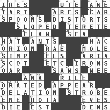 ACROSS 1. Angers 5. Shoshoni 8. Deep reverence 11. Small pie 12. Ancient Greek god of war 13. 4-wheeled motor vehicle 14. Soup utensils 17. What propaganda does 19. Inclined 21. Cylindrical with tapered ends 22. Enthusiasm 23. Ocean 24. Floor covering 27. Pismires 29. Apple computer (short form) 32. Greek mythologigal hunter 34. Actress Charlotte 36. Undercover agent 37. Simple or foolish person 38. Raised railways 39. Operatic vocal solo 40. Native of Scotland 41. And so on (abbr.) 42. Metal shackles 43. Boat paddle 44. Without 46. Born 47. Nursemaid (var.) 50. Cause heat under the collar 52. Declaimed 55. Become visible 57. Conveyance 59. Disco prop 62. Compass dir. 63. Round or rotation of duties 64. Nights before holidays 65. Expire 66. Eastern Standard Time (abbr.) 67. Lairs DOWN 1. It is 2. Strike 3. Greek god of love 4. Fur scarf 5. RI univ. 6. Trials 7. First name in cosmetics 8. 1/640 square mile 9. Electrical Unit 10. Celtic language 12. Increase 15. Pitcher Ryan 16. Connect, as a bridge 18. Mouth or opening 20. Main course 24. With motion or animation 25. N. Chile seaport 26. The easternmost of the Lesser Sundas 28. Table seasonings 29. Person of subnormal intelligence 30. Place in a line 31. Stop 33. Choose 35. Fortification 36. Third mo. 42. Small island 45. Pinches, bites 47. "One Day ___ Time" 48. Distance measurement (Brit.) 49. Goodbye (Sp.) 51. Having ears or earlike features 52. Wrote a lyric poem 53. Painter Guido (1575-1642) 54. Toward shelter 55. Santa ___, CA 56. Be footloose 58. Baseball player Mel 60. Benjamin's nick name 61. Double-curved letter
