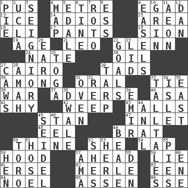 ACROSS 1. Fluid product of inflammation 4. Distance measurement (Brit.) 9. Mild oath 13. Frozen water 14. Goodbye (Sp.) 15. Length times width 16. Connecticut Ivy Leaguer 17. Leg coverings 18. The Jewish people; Israel 19. Grow older 21. Lion 22. American astronaut and politician John 24. Nathan's nickname 26. Lubricate 27. Capital of Egypt 29. Small boys 30. Amid 31. Spoken 33. Neckwear 36. Armed conflict 37. Contrary to your interests or welfare 40. White ___ sheet 41. Like a shrinking violet 42. Shed a tear 43. Shopping centers 45. Comedian Laurel of Laurel & Hardy 47. An arm off of a larger body of water 48. Snakelike fish 49. Naughty child 50. One or ones belonging to thee 52. A female animal or person 54. Infant locale 56. Parka part 57. At or in the front 59. Untruth 61. Celtic language 62. Haggard of country music 63. Car or cant ending 64. Christmas carol 65. NE Netherlands city 66. Compass dir. DOWN 1. Sliced dessert 2. Southern CA. univ. 3. Signiory (variant) 4. Atlas unit 5. Peak District village in England 6. Prong on a fork 7. Printing process, for short 8. Double-curved letter 9. Artist's stands 10. Amused look 11. A really long time 12. Daniel's nick name 20. Merit 22. Scores awarded for successful feats 23. Flaplike covering 25. Ancient Roman robe 27. Crow sounds 28. Wet nurse 29. Canvas cover 31. Baking chamber 32. Portuguese money of account (variant) 33. Baron Munchausen's specialties 34. Capri or Wight 35. 90 degrees 38. A sleeping potion; an opiate (poet.) 39. Arab leader 44. Of or related to the anus 45. A glass for beer 46. "___ Little Indians" 49. Memphis, Tenn. Street 50. "Corrida" creature 51. Stockings 52. "______ My Girl" (Turtles hit) 53. Possessive pronoun 55. Sliced desserts 56. Layer 57. Housemaid (var.) 58. Lair 60. Compass dir.