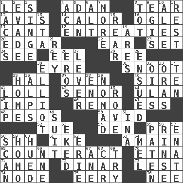 ACROSS 1. French article 4. First man 8. Pull into pieces 12. Opinion 14. Bodily heat indicating an inflammation 16. Stare 17. Patter 18. Pleas 20. _ Allan Poe 22. Ewer handle 23. Put into a specified state 24. Observe 25. Snakelike fish 28. To sift 30. Jane of fiction 31. Snob 35. Actor Linden 37. Baking chamber 40. Father 41. Hang loosely or laxly 42. Sir (Sp.) 44. Uhlan (variant) 45. Body of Kaffir warriors 46. San ____ (Riviera town) 47. Curvy letter 48. Mexican monetary units 50. Enthusiastic 52. Third day of the wk. 54. Lair 55. Before (prefix) 58. Quiet! 61. D.D.E's nickname 63. With great haste 65. Neutralize 70. Inactive volcano in Sicily 71. So be it 72. Middle Eastern gold or silver currency 73. For fear that 74. Thickened enlargement 75. Suggestive of the supernatural 76. Born DOWN 1. Shoestrings 2. Elude 3. Burn superficially 4. Adept person 5. One of the 12 tribes of Israel 6. The first octave above the treble staff 7. Greater amount 8. Small child 9. Armor plate that protects the chest 10. Toward shelter 11. State of inaction 13. R.R. building 15. Posterior 19. Ancient Greek god of war 21. Marina Del _, California 26. Greek god of love 27. Prying instrument 29. Took place subsequently 30. American author Paul (1891-1958) 32. Petroleums 33. Mouths or openings 34. "___ Little Indians" 35. Dwelling 36. High mountains 38. Compass dir. 39. Wanderer 41. Mouth edge 43. Be footloose 49. Costume for a special activity 51. _ tizzy (2 wds.) 53. Made supply last 55. Eucharist need 56. Remove soap 57. Related on the mother's side 58. Skim 59. Same (prefix) 60. Took on color 62. 4th largest of the Great Lakes 64. Cartoonist voice _ Blanc 66. Compass dir. 67. A saturated hydrocarbon 68. 4-wheeled motor vehicle 69. Attempt