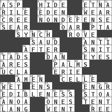 ACROSS 1. Viper 4. Flintstone garb 8. Inactive volcano in Sicily 12. Cause heat under the collar 14. Locale of original sin 15. Put on (as clothing) 16. Algonquian 17. Unrelated to defense, as in spending 20. Dry up 21. Boat paddle 22. Parent Teacher Association (abbr.) 23. Synchronize (abbr.) 27. Be footloose 29. Saudi Arabian king (1953-1964) 31. Opposed to 34. Following 35. In a ____ (agitated or irritated) 36. Small amounts or degrees 39. One of the 12 tribes of Israel 41. Snake ____ (dice throw) 42. Ancient Greek god of war 43. Insides of hands 46. Southern CA. univ. 47. 4th largest of the Great Lakes 48. So be it 51. Cell (Danish) 54. Soggy 56. Followers of ems 58. Engineer (abbr.) 61. The property of being fit to eat 66. Portico 67. Small Philippine buffalo 68. Washington bills 69. Portable shelter 70. Long (Scottish) 71. Gone 72. To separate or throw off DOWN 1. Curves 2. The founder of a family 3. Entreaties 4. Layer 5. Wedding promise 6. Lair 7. Inside; within (prefix) 8. She-sheep 9. 3-inch nail 10. Political cartoonist Thomas 11. Length times width 13. Suggestive of the supernatural 18. Ewer handle 19. Away 24. Science/research agcy. 25. Feline 26. Became colored 28. Flower holders 30. Window treatment 32. Standoff 33. It is 34. Indian state 36. The 19th letter of the Greek alphabet 37. Curve 38. Accusation by an informer 40. Drug cop 44. Whopper 45. Cartoonist voice _ Blanc 49. Snakelike fish 50. Compass dir. 52. For fear that 53. Keyboard key 54. Welt 55. Pulitzer Prize-winning author Ferber 57. Overwhelm 59. Went 60. Pace 62. Container for groceries 63. Compass dir. 64. Elected rep. 65. Fast jet (abbr.)