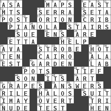 ACROSS 1. White ___ sheet 4. Atlas contents 8. Compass direction 12. Mountains (abbr.) 13. Spanish missionary in California 14. Stalk of a moss capsule 15. Mail 17. Greek mythologigal hunter 18. Baby bed with high sides 19. Player piano 21. Flight of steps 23. Take to court 24. Followers of ems 26. "We ___ not amused" (Victoria) 27. Singer James 28. Aid 30. Actress Gardner 31. Disco prop 34. Being at a high temperature 37. "___ Little Indians" 38. Capital of Egypt 39. Chicken ___ king 40. Eastern Standard Time (abbr.) 41. Place where plants grow 42. Experiment locale 43. Plant holders 44. Small quarrel 46. Boy, to dad 47. It is 50. Tate display 51. Wine fruits 54. Responses 57. Cause heat under the collar 58. Radiant circles of light 60. Costume for a special activity 62. "If ____ say so..." 63. Unconcealed 64. Three (prefix) 65. Unadorned 66. Trial 67. Layer DOWN 1. Electrical Unit 2. Halt 3. Aide 4. Haggard of country music 5. Believer in; advocate of (suffix) 6. Adept person 7. Without 8. Fortification 9. Nest on high 10. Disorderly outburst 11. Bar bills 13. "Barney Miller" actor Jack 16. Drawn tight 20. Teachers' org. 22. Falsehood 25. Dinah or Pauly 27. Nights before holidays 29. Inky black, to poets 30. Had dinner 31. Scram, to a cat 32. Tarsus (plural) 33. To free from 34. Not exactly gospel 35. Norwegian king 36. Keyboard key 41. Went 43. Wimpy's pal 44. The 23rd letter of the Hebrew alphabet 45. Angers 46. Vegetable dish 48. Lies 49. Derisive sound 51. Amused look 52. Tall New Zealand timber tree 53. Went for two points 55. Fast jet (abbr.) 56. Beget 59. "___ Maria" 61. Shallow baking pan