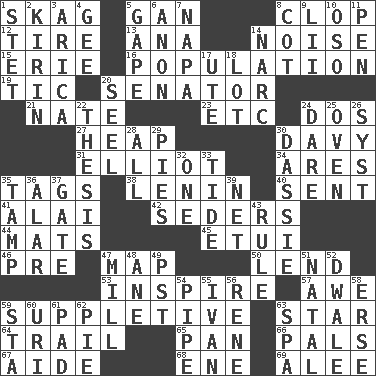 ACROSS 1. Heroin 5. Separate the seeds from cotton 8. Hoof sound 12. Hoop that covers a wheel 13. Santa ___, CA 14. Annoying sound 15. 4th largest of the Great Lakes 16. Census information 19. Nervous spasm 20. Elected representative 21. Nathan's nickname 23. And so on (abbr.) 24. Two (Sp.) 27. Pile 30. American folk hero Crockett 31. American author Paul (1891-1958) 34. Ancient Greek god of war 35. Labels 38. Soviet premier 1918-24 40. Transmitted 41. Mountain range southwest of Kyrgyzstan 42. Spring feasts 44. Floor protectors 45. Needle holder 46. Before (prefix) 47. Atlas unit 50. Grant temporary use of 53. Motivate 57. Deep reverence 59. Supplementary 63. Play the lead 64. Drop behind 65. Baking dish 66. Friends 67. Helper 68. Compass dir. 69. Toward shelter DOWN 1. Proofreading order 2. Japanese brewing company 3. N. Chile seaport 4. Unit of force equal to gravity 5. Yawn 6. At once, immediately (arch.) 7. California wine valley 8. Small bed 9. Cards in a Roman deck? 10. Bear (Spanish) 11. Fenced enclosure 14. Drug cop 17. Shoshoni 18. Car dealer's back yard 20. Stitch closed the eyes of (a falcon) 22. College paper 24. Have the gumption 25. Baking chamber 26. System (abbr.) 28. 100% 29. Sliced desserts 30. Small ungulate mammals of Africa 32. Single 33. Periodic rise and fall of the sea level 35. Pack (down) 36. Having or resembling wings 37. Yard entry 39. Remaining after all deductions 43. General guideline 47. Place where flour is made 48. A saturated hydrocarbon 49. Pacific Standard Time (abbr.) 51. Relating to or accompanying birth 52. A sleeping potion; an opiate (poet.) 54. Corncob 55. "Terrible" tsar 56. French philosopher Descartes 58. Celtic language 59. R.R. building 60. RI univ. 61. Writing tablet 62. Sliced dessert 63. Health resort