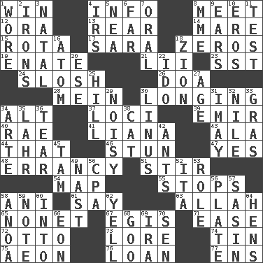 ACROSS 1. Victory 4. Information 8. Confront 12. Mouth or opening 13. Posterior 14. Female horse 15. Round or rotation of duties 17. "Two Mules for Sister ____" 18. Nothings 19. Related on the mother's side 21. Cards in a Roman deck? 23. Fast jet (abbr.) 24. Make a splashing sound 26. ___ good deed 28. Count _ (2 wds.) 30. Yearning 34. The first octave above the treble staff 37. Venues 39. Independent ruler or chieftain 40. Actress Charlotte 41. Climbing, woody, usually tropical vines 43. Chicken ___ king 44. Not this but _ 46. Surprise greatly 47. It is so 48. Tendancy to err 51. Tumult 54. Atlas unit 55. Obstructs or blocks passage 58. Black tropical American cuckoo 61. Declare 63. Assad's deity 65. Music written for nine 67. The front part of a cuirass 71. Relaxation 72. "Beetle Bailey" pooch 73. Old wives' tales, e.g. 74. Metal container 75. A really long time 76. Grant temporary use of 77. Followers of ems DOWN 1. Had on 2. Removes the wrinkles 3. Relating to or accompanying birth 4. Big collection agency 5. Teachers' org. 6. At a great distance 7. Spoken 8. Madame (abbr.) 9. Hearing organs 10. Greek god of love 11. Trial 16. Tiny particle 18. The Jewish people; Israel 20. Compass dir. 22. Wedding promise 25. Land elevation 27. Personal question 29. Annoyingly loud 30. "_ and Lucy" (Charlie Brown theme song) 31. "If ____ say so..." 32. "Death on the ____" 33. Pate de foie ____ 34. Johnson of "Laugh-In" 35. Cowardly lion portrayer 36. Pull into pieces 38. Feline 42. Pismires 45. Scottish cap 49. Political cartoonist Thomas 50. Tax preparer (abbr.) 52. Call ___ day 53. Hero or heavy, e.g. 56. Food holder 57. Indian antelope 58. Small Philippine buffalo 59. Make mention of 60. To the inside or interior of 62. Shout 64. Coop moms 66. Period of immesurable duration 68. Thick or sticky substance 69. Lyricist Gershwin 70. Elected rep.