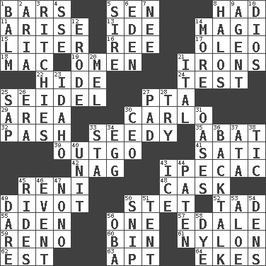 ACROSS 1. Drinking establishments 5. Elected rep. 8. Possessed 11. Originate 13. Binary compound 14. Wise men 15. 61 cubic inches 16. To separate or throw off 17. Margarine 18. Big _ 19. Sign of things to come 21. Removes the wrinkles 22. Flintstone garb 24. Trial 25. A glass for beer 27. Parent Teacher Association (abbr.) 29. Length times width 30. Monte _, Las Vegas Hotel/Casino 32. Romantic infatuation 33. Full of seeds 35. Blind as ____ 39. Outlay 41. Suttee (variant) 42. Tired old horse 43. Medicinal drug used to evoke vomiting 45. Painter Guido (1575-1642) 48. Keg 49. A piece of turf (Scot.) 50. Proofreading order 52. Small boy 55. An important port of Yemen 56. Single 57. Peak District village in England 59. Former U.S. Attorney General Janet 60. Storage container 61. High-strength synthetic material 62. Eastern Standard Time (abbr.) 63. Fitting 64. Supplements with great effort DOWN 1. Lip ointment 2. Roberta Peters solo 3. Actors Guy, Robert Welles, and Clint 4. Compass dir. 5. Father 6. Locale of original sin 7. Born 8. Auras 9. Rep 10. "Vaya con ____" 12. Wear away 14. Greater amount 20. Cartoonist voice _ Blanc 21. Slanted text style (abbr.) 23. Potato state 25. Plant excrement 26. Period 27. Writing tablet 28. Attempt 30. Corporate head (abbr.) 31. Fertile tracts in a desert 33. R.R. building 34. Oval reproductive body of a fowl 36. Sass 37. "One Day ___ Time" 38. Nervous spasm 40. A single undivided whole 43. Frozen water 44. Eucharist need 45. Amusement-park features 46. Happening 47. Words to Nanette 49. Have the gumption 50. Sever or remove by pinching or nipping 51. Portable shelter 53. Medicinal plant 54. Cub Scout units 56. Chief or king in Benin or Nigeria 58. Color