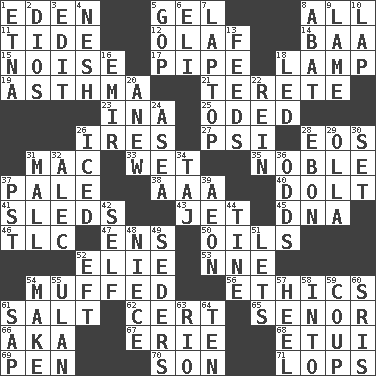 ACROSS 1. Genesis locale 5. Set 8. 100% 11. Event that recurs at intervals 12. Norwegian king 14. Sound made by sheep 15. Annoying sound 17. Corncob 18. Desk light 19. Respiratory problem 21. Cylindrical with tapered ends 23. _ tizzy (2 wds.) 25. Wrote a lyric poem 26. Angers 27. 23rd letter of the Greek alphabet 28. Greek goddess of the dawn 31. Apple computer (short form) 33. Dripping 35. Having high moral qualities 37. Light colored 38. American Automobile Association (abbr.) 40. Dunce 41. Bobsleighs 43. Type of plane 45. Heredity factor (abbr.) 46. Affectionate concern, for short 47. Followers of ems 50. Lubricates 52. Writer Wiesel 53. Compass dir. 54. Performed or handled clumsily 56. Value system 61. Table seasoning 62. Certainty 65. Sir (Sp.) 66. Alias (abbr.) 67. One of the Great Lakes 68. Needle case 69. Writing instrument 70. Male offspring 71. Chops off DOWN 1. Inactive volcano in Sicily 2. "Vaya con ____" 3. Prepare for publication 4. Delicate 5. Republican Party 6. Biblical high priest 7. Portable computer 8. Blind as ____ 9. Unable to walk 10. Pet locale 13. Gives food to 16. Arab leader 18. Directed 20. Afresh 22. It's straight from the horse's mouth 24. At sea 26. On the rocks 28. Inky black, to poets 29. Rounded earthenware pot or jar 30. Arrange properly for use 31. Shopping center 32. Actor Baldwin 34. _ Mahal 36. Probability 37. Pacific Standard Time (abbr.) 39. A really long time 42. Itself 44. Prong on a fork 48. Sibling's daughter 49. Spring feasts 51. Allows 52. Newt 54. Create 55. ____ Bator, Mongolia 57. The bottom of a shoe or boot 58. To the inside or interior of 59. Clever action or accomplishment 60. Indian titles of respect 61. Plant excrement 63. River (Sp.) 64. "___ Little Indians"