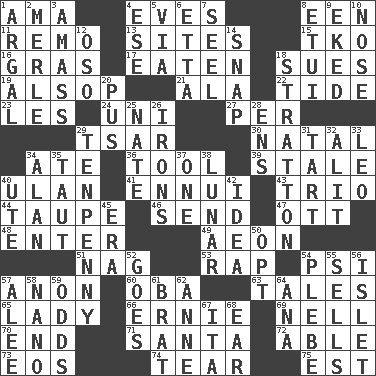 ACROSS 1. Housemaid (var.) 4. Nights before holidays 8. Car or cant ending 11. San ____ (Riviera town) 13. Locates 15. Ring climax 16. Pate de foie ____ 17. Eroded 18. Institutes legal proceedings 19. Columnist Joseph or Stewart 21. Chicken ___ king 22. Event that recurs at intervals 23. French article 24. Single; one (prefix) 27. For each 29. Russian ruler of old 30. Brizilian seaport 34. Had dinner 36. Utensil 39. Showing deterioration from age 40. ____ Bator, Mongolia 41. World-weariness 43. Musical group of three 44. Grayish beige 46. Post 47. Baseball player Mel 48. Keyboard key 49. Period of immesurable duration 51. Tired old horse 53. Strike 54. Air pressure measure (abbr.) 57. Soon (poet.) 60. Chief or king in Benin or Nigeria 63. Stories 65. Kenny Rogers chart-topper in '80 66. Bert's buddy 69. 1994 drama film starring Jodie Foster 70. Conclude 71. Before Barbara or Clara 72. Competent 73. Greek goddess of the dawn 74. Pull apart 75. Eastern Standard Time (abbr.) DOWN 1. Therefore, facetiously 2. Haggard of country music 3. Collect or gather 4. Compass dir. 5. By way of 6. Singer James 7. Sew up the eyelids of hawks and falcons 8. Needle holder 9. Supplemented with great effort 10. Characteristic smell of wine 12. Bear (Spanish) 14. Fastener 18. Ski resort town in Vermont 20. Fluid product of inflammation 25. Nathan's nickname 26. Removes the wrinkles 28. Followers of ems 29. 3-inch nail 31. Small pie 32. Came down and settled, as after flight 33. Lion 34. Actor Alda or Thicke 35. Drawn tight 37. Single 38. Type of eclipse 40. Shoshoni 42. It may be bright or harebrained 45. Epoch 50. Choose 52. Travels 54. First-year military academy student 55. Exchanges for money 56. Small island 57. Toward shelter 58. Billionth: prefix 59. Probability 61. Naughty child 62. Queen of England 1702-14 64. Santa ___, CA 67. Call ___ day 68. Hearing organ