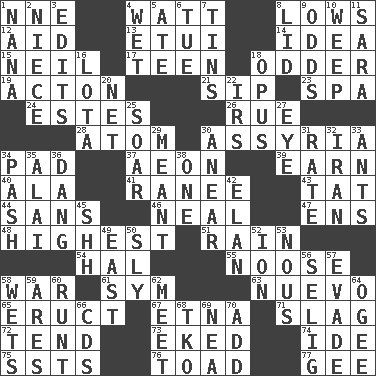 ACROSS 1. Compass dir. 4. Electrical Unit 8. Moos 12. Help 13. Needle case 14. The content of cognition 15. Famous astronaut Armstrong 17. Adolescent 18. More peculiar 19. 13-14th century defensive garment 21. Small drink 23. Health resort 24. _____ Park, CO 26. Sorrow 28. Tiny particle 30. Nineveh was its capital 34. Groovy apt. 37. A really long time 39. Merit 40. In the manner of 41. Indian princess (variant) 43. Make lace 44. Without 46. Anneal 47. Followers of ems 48. Having the greatest elevation 51. Water falling in drops from the sky 54. Actor Linden 55. Trap for birds or small mammals 58. Armed conflict 61. Symbol (abbr.) 63. New (sp.) 65. Spew [out] 67. Inactive volcano in Sicily 71. Volcanic refuse 72. Look after 73. Made supply last 74. Binary compound 75. Fast planes 76. Frog relative 77. Unit of force equal to gravity DOWN 1. Grandmother 2. Sibling's daughter 3. Prepares for publication 4. Dripping 5. Had dinner 6. Third day of the wk. 7. Canisters 8. Flaplike covering 9. Probability 10. Shed a tear 11. "Two Mules for Sister ____" 16. Globular water bottle used in Asia 18. Musical composition 20. Fish or hair follower 22. Big collection agency 25. Fly high 27. Sight organ 29. Intended 30. Approach 31. Pace 32. SW Asia republic 33. Pismires 34. Romantic infatuation 35. Mountain range southwest of Kyrgyzstan 36. Mild oath, euphamism for damn 38. Single 42. Flair 45. Quiet! 49. Compass direction 50. Playfully artful 52. Electrically charged atom 53. Good sense 56. Major League Baseball Commissioner Bud 57. Elude 58. Moistens 59. Ancient Greek god of war 60. Undersized animal 62. Rendezvous 64. Double curve, resembling the letter S 66. Music discs 68. Ring climax 69. Teachers' org. 70. Increase