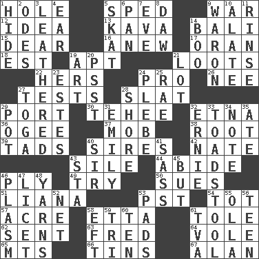 ACROSS 1. Opening into or through something 5. Drove too fast 9. Armed conflict 12. The main thing one is thinking about 13. Polynesian shrub of the pepper family 14. Indonesian resort city 15. Letter starter 16. Afresh 17. Northwest Algerian city 18. Eastern Standard Time (abbr.) 19. Fitting 21. Plunders 22. Possessive pronoun 24. Adept person 26. Born 27. Trials 28. Narrow board 29. Sweet dark-red dessert wine 30. Giggle 32. Inactive volcano in Sicily 36. Double curve, resembling the letter S 37. Disorderly crowd 38. Carrot, for example 39. Bits 40. Founders of families 42. Nathan's nickname 43. Drop; flow; fall 44. Remain 46. Strand of rope, yarn or thread 49. Attempt 50. Takes to court 51. Climbing, woody, usually tropical vines 53. Pacific Standard Time (abbr.) 54. Small child 57. 43,560 square feet 58. Singer James 61. Lacquered or enameled metalware 62. Transmitted 63. Flintstone 64. Short-tailed, large-bodied rat 65. Mountains (abbr.) 66. Metal containers 67. Actor Alda or Thicke DOWN 1. Flintstone garb 2. Lyric poems 3. Resembling or made to resemble leather 4. Hearing organ 5. Three-handed card game 6. Baking dish 7. First lady 8. Fool 9. Make _____ (do battle with) 10. Having winglike extensions 11. Wash lightly 14. Sometimes accompanies a hiss 19. Nonscientific branch of learning 20. Inconspicuous attention getter 21. Car dealer's back yard 23. _____ Park, CO 24. Cadet 25. Actress Charlotte 27. Ancient Roman robe 28. Dinah or Pauly 29. Cooking vessel 31. Poet Dickinson 32. Bert's buddy 33. Inedible or poisonous agaric 34. Observe 35. Had dinner 40. Title for a knight 41. Backtalk 43. R.R. building 45. On the contrary 46. Suffix with ecto or cyto 47. It is permitted: Lat. 48. Tall tales 52. Fish or hair follower 53. Writing tablets 55. Water jar 56. Adolescent 58. Lizard (obsolete) 59. Three (prefix) 60. Nine, plus one 61. Federal power corp.