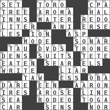 ACROSS 1. Put into a specified state 4. "Corrida" creature 8. Accounting whiz (abbr.) 11. Family _ (genealogy) 13. Scent 15. Actor Linden 16. Lodging establishments 17. Mother 18. Make new 19. 61 cubic inches 21. Black tropical American cuckoo 22. Celtic language 23. French article 24. Electrically charged atom 27. Cleo's killer 29. Method 30. Echolocation 34. The 19th letter of the Greek alphabet 36. Movie discs 39. Heavy duty weighing machine 40. Habitations of wild animals 41. Costumes for special activities 43. Wig 44. Consumed 46. Scorch 47. Raised railways 48. Compose 49. One who doesn't tell the truth 51. The 23rd letter of the Hebrew alphabet 53. Double-curved letter 54. Chief or king in Benin or Nigeria 57. Have the gumption 60. Car or cant ending 63. Composer Copland 65. Angers 66. Came up 69. Actor's bit 70. Ocean 71. Cowboy competition 72. Ancient Roman robe 73. Auto 74. Elected reps. 75. And not DOWN 1. Free of sound 2. Bert's buddy 3. Portable shelters 4. Scottish cap 5. Mouth or opening 6. Round or rotation of duties 7. Sign of something about to happen 8. "Mermaids" star 9. Groovy apts. 10. Medicinal plant 12. Compass dir. 14. Operatic vocal solo 18. News announcer 20. _ de Janeiro 25. Probability 26. Mole, birthmark 28. Fast jet (abbr.) 29. French bagpipes 31. Christmas carol 32. Pismires 33. To separate or throw off 34. Pull apart 35. Opposed to 37. Expire 38. Showing deterioration from age 40. Morning condensation 42. Indian titles of respect 45. Teachers' org. 50. White ___ sheet 52. Put on (as clothing) 54. Greek mythologigal hunter 55. Beat drum 56. Approach 57. Compact _ 58. Length times width 59. Hitchcock's "____ Window" 61. Greek god of love 62. Thickened enlargement 64. Keyboard modifier key 67. Elected rep. 68. Greek goddess of the dawn