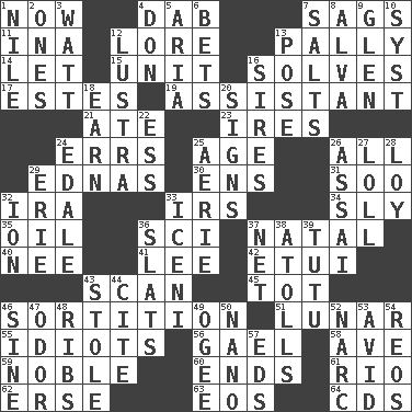 ACROSS 1. Immediately 4. Small moist lump or mass 7. Sinks 11. _ tizzy (2 wds.) 12. Old wives' tales, e.g. 13. Friendly 14. Allow 15. A single undivided whole 16. Finds the solution 17. _____ Park, CO 19. Aide 21. Had dinner 23. Angers 24. Blunders 25. Mature 26. 100% 29. Ferber et al. 30. Followers of ems 31. "Barney Miller" actor Jack 32. Lyricist Gershwin 33. Big collection agency 34. Cunning 35. Petroleum 36. _-fi 37. Brizilian seaport 40. Born 41. Area sheltered from the wind 42. Needle case 43. Glance over 45. Small child 46. Casting lots 51. Type of eclipse 55. Foolish or stupid persons 56. Highlander 58. "___ Maria" 59. Having high moral qualities 60. Extremities 61. River (Sp.) 62. Celtic language 63. Greek goddess of the dawn 64. Music discs DOWN 1. Mediterranean tributary 2. Singles 3. Electrical Unit 4. Spanish title 5. Operatic vocal solo 6. Antes 7. Table seasonings 8. Inventor's middle name 9. Small, secluded valley 10. System (abbr.) 12. A period of five years 13. Airs 16. Begets 18. Merit 20. Omens 22. Double-curved letter 24. Peak District village in England 25. Nest on high 26. Slender Brazilian palm 27. Hang loosely or laxly 28. Myrna of the movies 29. One of the Great Lakes 32. Electrically charged atom 33. Ancient Celtic tribe of eastern Britain 36. Narrow boards 37. Fish or hair follower 38. Ringlike coral islands and reefs 39. Ballerina skirt 43. Fur scarf 44. Quote 46. Trig term 47. Scent 48. Teases 49. Double curve, resembling the letter S 50. Billionth: prefix 52. Drug cop 53. Enthusiastic 54. Vintage cars 57. Begley and Asner