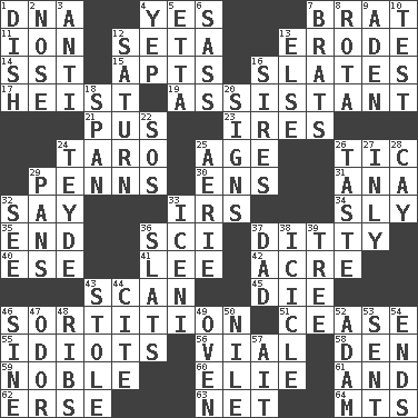 ACROSS 1. Heredity factor (abbr.) 4. Consenting reply 7. Naughty child 11. Electrically charged atom 12. Stalk of a moss capsule 13. Wear away 14. Fast jet (abbr.) 15. Tenement units (abbr.) 16. Chalkboards 17. Robbery 19. Aide 21. Fluid product of inflammation 23. Angers 24. Edible starchy tuberous root 25. Mature 26. Nervous spasm 29. Actor Sean's family 30. Followers of ems 31. Santa ___, CA 32. Declare 33. Big collection agency 34. Roguish 35. Conclude 36. _-fi 37. Simple song 40. Compass dir. 41. Area sheltered from the wind 42. 1/640 square mile 43. Glance over 45. Pass on 46. Conclusion 51. Desist 55. Foolish or stupid persons 56. Small bottle 58. Lair 59. Having high moral qualities 60. Writer Wiesel 61. Also 62. Celtic language 63. Remaining after all deductions 64. Mountains (abbr.) DOWN 1. Food container 2. Olfactory organ 3. Opposed to 4. Slangy assent 5. Singer James 6. Backtalk 7. Naughty children 8. Roll call or roster of names 9. An important port of Yemen 10. Trial 12. Titan orbits this 13. Otherwise 16. Begets 18. Connect, as a bridge 20. Omens 22. Distress signal 24. Miss Universe 1986, Barbara Palacios _ 25. Nest on high 26. Clothes sense 27. Inwardly 28. Island 29. Baking dishes 32. Perceive with the eye 33. Ancient Celtic tribe of eastern Britain 36. Narrow boards 37. Male parent 38. Tapering mass of hanging ice 39. Relationship diagram 43. Fur scarf 44. Quote 46. Trig term 47. Scent 48. Chest bones 49. Baking chamber 50. The longest river in the world 52. First man 53. Transmitted 54. Extremities 57. Small island