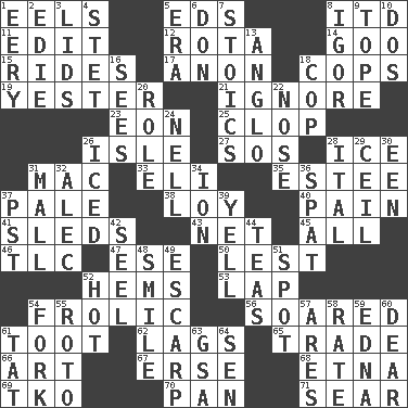 ACROSS 1. Snakelike fish 5. Begley and Asner 8. It would 11. Prepare for publication 12. Roll call or roster of names 14. Thick or sticky substance 15. Amusement-park features 17. Soon (poet.) 18. 911 reaches them 19. Of or pertaining to yesterday 21. Snub 23. Period of immesurable duration 25. Hoof sound 26. Small island 27. Mayday 28. Frozen water 31. Big _ 33. Connecticut Ivy Leaguer 35. First name in cosmetics 37. Diluted with white 38. Myrna of the movies 40. Ache 41. Bobsleighs 43. Remaining after all deductions 45. 100% 46. Affectionate concern, for short 47. Compass dir. 50. For fear that 52. Equivocates 53. Infant locale 54. Play 56. Flew 61. A blast of a horn 62. Falls behind 65. Swap 66. Tate display 67. Celtic language 68. Inactive volcano in Sicily 69. Ring climax 70. Baking dish 71. Burn superficially DOWN 1. Suggestive of the supernatural 2. Singer Brickell 3. Hats (slang) 4. Proofreading order 5. Epoch 6. Spanish title 7. Unemotional ones 8. Composer Stravinsky 9. Drink excessively 10. Two (Sp.) 13. White American of non-Hispanic descent 16. Perceives with the eye 18. Police officer (slang) 20. Hero or heavy, e.g. 22. Characteristic smell of wine 24. 1994 drama film starring Jodie Foster 26. On the rocks 28. Slanted text style (abbr.) 29. To provide with a ceiling 30. Car or cant ending 31. Shopping center 32. Actor Baldwin 34. Electrically charged atom 36. Petty quarrel 37. Pacific Standard Time (abbr.) 39. Shout 42. Stitch closed the eyes of (a falcon) 44. Beverages made from leaves 48. Grin 49. Fortification 51. Specific locale 52. Being at a high temperature 54. Tined utensil 55. Printing process, for short 57. Ancient Greek god of war 58. Assign a rank or rating to 59. Pulitzer Prize-winning author Ferber 60. Letter starter 61. Make lace 63. Girls' org. (abbr.) 64. Elected rep.