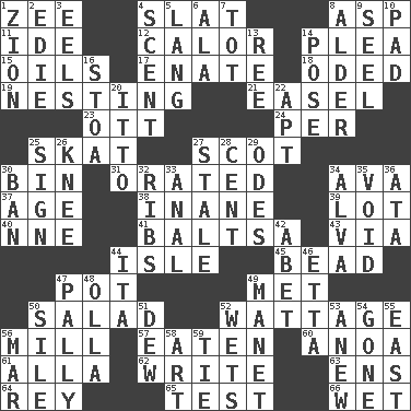 ACROSS 1. Last letter of the English alphabet 4. Narrow board 8. Cleo's killer 11. Binary compound 12. Bodily heat indicating an inflammation 14. Entreaty 15. Petroleums 17. Maternal 18. Wrote a lyric poem 19. Inhabiting a nest 21. Artist's stand 23. Baseball player Mel 24. For each 25. Three-handed card game 27. Native of Scotland 30. Storage container 31. Declaimed 34. Actress Gardner 37. Ripen 38. Empty; void 39. Car dealer's back yard 40. Compass dir. 41. Greek mezzo-soprano Agnes 43. By way of 44. Small island 45. Necklace unit 47. Cooking vessel 49. Was introduced to 50. Vegetable dish 52. Electrical Measurement 56. Place where flour is made 57. Eroded 60. Small Philippine buffalo 61. Silent film actress Nazimova 62. Compose 63. Followers of ems 64. Marina Del _, California 65. Trial 66. Dripping DOWN 1. The Jewish people; Israel 2. Singer Brickell 3. Snakelike fish 4. Odor 5. Austrian-born American filmmaker Fritz 6. Wing 7. Small child 8. Tree or shrub in the Birch family 9. Sew up the eyelids of hawks and falcons 10. Writing tablet 13. To riddle 14. Introduce or present, as a question 16. Portico 20. "Tell ____ the Marines!" 22. Fitting 25. Public display of a written message 26. Leg joint 27. Showing deterioration from age 28. Penny 29. Lyric poems 30. Prohibit 32. Teases 33. Of or related to the anus 34. Inventor's middle name 35. Nothingness 36. "One Day ___ Time" 42. Collude with 44. Call ___ day 46. Singer James 47. Friendly 48. Spanish pot 49. French painter Edouard 50. Drop; flow; fall 51. Morning condensation 52. Moistens 53. Afresh 54. Went 55. 90 degrees 56. Third mo. 58. Tate display 59. Standoff