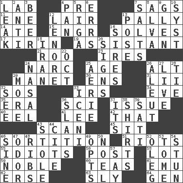ACROSS 1. Experiment locale 4. Before (prefix) 7. Sinks 11. Compass dir. 12. Den 13. Chummy 14. Had dinner 15. Engineer (abbr.) 16. Finds the solution 17. Japanese brewing company 19. Aide 21. Friend of Pooh 23. Angers 24. Drug cop 25. Ripen 26. Keyboard modifier key 29. French painter Edouard 30. Followers of ems 31. Cards in a Roman deck? 32. Distress signal 33. Big collection agency 34. First lady 35. Period 36. _-fi 37. Come out of 40. Snakelike fish 41. Area sheltered from the wind 42. Not this but _ 43. Skim 45. Be seated 46. Conclusion 51. Debaucheries 55. Foolish or stupid persons 56. Mail 58. Car dealer's back yard 59. Having high moral qualities 60. Afternoon social gatherings 61. Australian flightless bird 62. Celtic language 63. Cunning 64. Commissioned military rank (abbr.) DOWN 1. Path through which fluid escapes 2. Opposed to 3. Fermented drink made from hops 4. Baking dish 5. Capital of Latvia 6. Blunders 7. Table seasonings 8. Inventor's middle name 9. Small, secluded valley 10. System (abbr.) 12. Poe poem 13. Airs 16. Begets 18. SW Asia republic 20. Public displays of written messages 22. Sep. follower 24. Rhinal 25. Nest on high 26. Eskimo relative 27. Moving, as bait 28. Make a knot 29. Greater amount 32. Observe 33. Ancient Celtic tribe of eastern Britain 36. Narrow boards 37. It is 38. Upper-body garments 39. Suttee (variant) 43. Took without asking 44. Quote 46. Trig term 47. Scent 48. Teases 49. Chooses 50. Christmas carol 52. Cassini of fashion 53. Heavy book 54. Astound 57. Declare