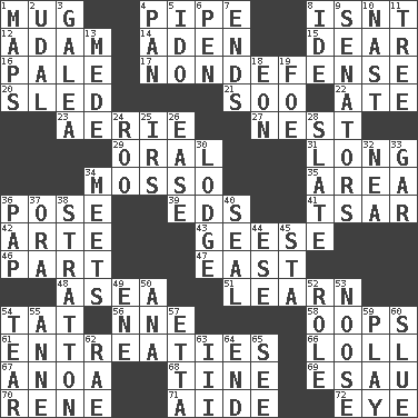 ACROSS 1. Java container 4. Corncob 8. Is not 12. First man 14. Arabian gulf 15. Letter starter 16. Diluted with white 17. Unrelated to defense, as in spending 20. Downhill vehicle 21. "Barney Miller" actor Jack 22. Had dinner 23. Nest on high 27. Egg locale 29. Of the mouth 31. Protracted 34. With motion or animation 35. Type of rug 36. Introduce or present, as a question 39. Begley and Asner 41. Russian ruler of old 42. Johnson of "Laugh-In" 43. Honkers 46. Role in a play 47. Compass direction 48. Toward the sea 51. Memorize 54. Make lace 56. Compass dir. 58. I made a mistake 61. Pleas 66. Hang loosely or laxly 67. Small Philippine buffalo 68. Prong on a fork 69. Son of Isaac 70. French philosopher Descartes 71. Helper 72. Sight organ DOWN 1. Atlas contents 2. Hereditary estate 3. An organ shaped like a helmet 4. Baking dish 5. Wedding promise 6. Animal enclosure 7. Conclusions 8. Binary compound 9. Elected representatives 10. Political cartoonist Thomas 11. Relationship diagram 13. Ancient Persian 18. A really long time 19. Enemy 24. Friend of Pooh 25. Big collection agency 26. Comfort 28. Schedule 30. Inn 32. Teachers' org. 33. Slender fish 34. Confronts 36. Infant food 37. Mouth or opening 38. Ski resort town in Vermont 40. Lick closed 44. Compass dir. 45. R.R. building 49. Compass dir. 50. Santa ___, CA 52. Hero or heavy, e.g. 53. Trap for birds or small mammals 54. Pull apart 55. Singer Murray 57. Singer James 59. Shaw product 60. Change direction abruptly 62. Actress Charlotte 63. One more than two 64. Conclusion 65. Observe