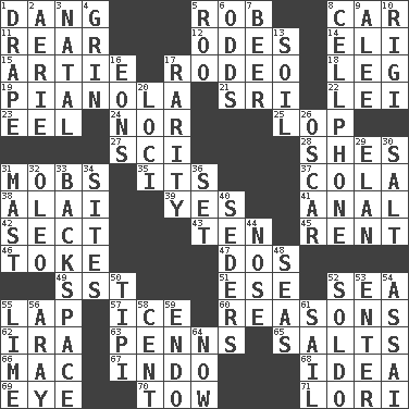 ACROSS 1. Mild oath, euphamism for damn 5. Director Reiner 8. Auto 11. Stern 12. Lyric poems 14. Connecticut Ivy Leaguer 15. Nick name for Arthur 17. Cowboy competition 18. Part of a journey 19. Player piano 21. Indian title of respect (Mr.) 22. Luau accessory 23. Snakelike fish 24. Not either 25. Trim (branches) 27. _-fi 28. "______ My Girl" (Turtles hit) 31. Disorderly crowds 35. ___ a Wonderful Life 37. Root beer relative 38. Mountain range southwest of Kyrgyzstan 39. Consenting reply 41. Of or related to the anus 42. Religious group 43. Nine, plus one 45. Monthly bill 46. Casino tip 47. Two (Sp.) 49. Fast jet (abbr.) 51. Compass dir. 52. Ocean 55. Pet locale 57. Frozen water 60. Thinks logically 62. Lyricist Gershwin 63. Actor Sean's family 65. Table seasonings 66. Apple computer (short form) 67. _ china 68. It may be bright or harebrained 69. Sight organ 70. Pull behind 71. Australian parrot (variant) DOWN 1. Window treatment 2. Nest on high 3. Brizilian seaport 4. Smile widely 5. Friend of Pooh 6. Likelihood 7. Fermented drink made from hops 8. Portable communications device 9. Toward shelter 10. Swiss mountan, "Queen of the Mountains" 13. Land 16. Immeasurably long periods of time 17. Noteworthy scarcity 20. Venues 26. Motion picture award 29. Flair 30. Table seasoning 31. Vertical spar for supporting sails 32. Butter sub 33. Keyboard key 34. Settings 36. Arrange properly for use 40. Spring feasts 44. Sense of smell 48. Oceans 50. Native american tent (variation) 52. Twentieth part of a lira 53. Keyboard key 54. Slender Brazilian palm 55. Citrus frut 56. Like ___ of sunshine 58. Penny 59. Inside; within (prefix) 61. Travel by water 64. At this time