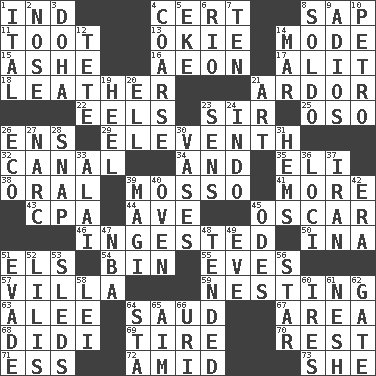 ACROSS 1. Indiana (abbr.) 4. Certainty 8. Plant excrement 11. A blast of a horn 13. Migrant worker of the '30s 14. Method 15. American tennis player Robert 16. A really long time 17. Came down and settled, as after flight 18. Cordwainer's material 21. Zeal 22. Snakelike fish 23. Title for a knight 25. Bear (Spanish) 26. Followers of ems 29. Veterans Day date 32. Lessep's creation 34. Added to 35. Biblical high priest 38. Relating to the mouth 39. With motion or animation 41. Greater amount 43. Numbers guy (abbr.) 44. "___ Maria" 45. Motion picture award 46. Consumed 50. _ tizzy (2 wds.) 51. Raised railways 54. Storage container 55. Nights before holidays 57. Country estate 59. Inhabiting a nest 63. Toward shelter 64. Saudi Arabian king (1953-1964) 67. Length times width 68. "You Light Up My Life" star Conn 69. Become fatigued 70. Respite 71. Curvy letter 72. Among 73. A female animal or person DOWN 1. Slanted text style (abbr.) 2. Characteristic smell of wine 3. Capital of the state of Qatar 4. Rough 5. Supplement with great effort 6. _ de Janeiro 7. Nine, plus one 8. Twentieth part of a lira 9. Goodbye (Sp.) 10. Stone: prefix 12. False hair 14. Spoil 19. The bottom of a shoe or boot 20. Pipe bend 21. Nonscientific branch of learning 23. Elected reps. 24. _ china 26. Environmental prefix 27. Drug cop 28. Fastener 30. Flower holders 31. Cloth borders 33. Jai ____ 36. Event scenes 37. SW Asia republic 39. Wise men 40. Baking chamber 42. Epoch 45. Lyric poems 47. Basketball assoc. 48. Watched over 49. First lady 51. Elude 52. Ms. Damita and namesakes 53. Bobsleighs 56. Play the lead 58. Flowery wreath 60. Angers 61. Tender 62. Yard entry 64. R.R. building 65. Direct toward a target or goal 66. RI univ.