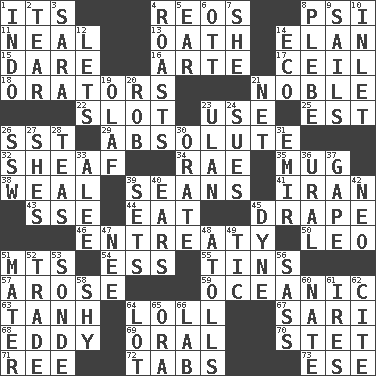 ACROSS 1. ___ a Wonderful Life 4. Vintage cars 8. 23rd letter of the Greek alphabet 11. Actress Patricia 13. Pledge 14. Liveliness 15. Have the gumption 16. Johnson of "Laugh-In" 17. To provide with a ceiling 18. Speakers 21. Impressive in appearance 22. Groove 23. Purpose 25. Eastern Standard Time (abbr.) 26. Fast jet (abbr.) 29. Utter; complete 32. Bundle of cut stalks of grain 34. Actress Charlotte 35. Large cup 38. Welt 39. Actors Connery and Penn 41. SW Asia republic 43. Compass dir. 44. Erode 45. Window treatment 46. Plea 50. Lion 51. Mountains (abbr.) 54. Curvy letter 55. Canisters 57. Came up 59. Pertaining to the sea 63. Hyperbolic tangent 64. Hang loosely or laxly 67. Indian skirt 68. Whirlpool 69. Relating to the mouth 70. Proofreading order 71. To riddle 72. Bar bills 73. Compass dir. DOWN 1. Southeast Asian peninsula 2. Lacerate 3. "Two Mules for Sister ____" 4. Ridicules or criticizes harshly 5. Hearing organ 6. Baseball player Mel 7. A female animal or person 8. First-year military academy student 9. Moves on water 10. An arm off of a larger body of water 12. Allows 14. Environmental prefix 19. Norwegian king 20. Director Reiner 21. Remaining after all deductions 23. Uhlan (variant) 24. Institutes legal proceedings 26. Compass dir. 27. "______ My Girl" (Turtles hit) 28. Afternoon social gatherings 30. Declaim 31. Independent ruler or chieftain 33. Toward shelter 36. Mountain range 37. Yawn 39. Puts into a specified state 40. Hearing organs 42. Modern: prefix 45. Centimeter-gram-second unit of force 47. Born 48. Ringlike coral islands and reefs 49. Nervous spasm 51. Mother 52. Buy and sell 53. Something which is sent 56. Backtalk 58. Like a shrinking violet 60. Nathan's nickname 61. Angers 62. Quote 64. Car dealer's back yard 65. Mouth or opening 66. Experiment locale