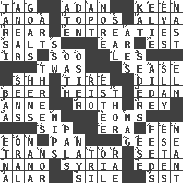 ACROSS 1. Label 4. First of billions? 8. Peachy ____! 12. Small Philippine buffalo 14. Literary convention 16. Inventor's middle name 17. Located in or toward the back 18. Pleas 20. Table seasonings 22. Hearing organ 23. Eastern Standard Time (abbr.) 24. Big collection agency 25. "Barney Miller" actor Jack 28. French article 30. It was, poetically 31. Gospel singer Marvin 35. Quiet! 37. Become fatigued 40. Deli pickle 41. Fermented drink made from hops 42. Robbery 44. Dutch treat 45. Queen of England 1702-14 46. Writer of Portnoy's Complaint (1969) 47. Marina Del _, California 48. NE Netherlands city 50. Immeasurably long periods of time 52. Small drink 54. Epoch 55. Opposite of masc. 58. A really long time 61. Baking dish 63. Honkers 65. Interpreter 70. Stalk of a moss capsule 71. Billionth: prefix 72. Damascus' land 73. Genesis locale 74. Having or resembling wings 75. Filth; sediment 76. Fast jet (abbr.) DOWN 1. Tarsus (plural) 2. Approach 3. Purposes of endeavors 4. Had dinner 5. Spanish title 6. Fitting 7. Greater amount 8. Krazy ___ of comics 9. Writer Wiesel 10. Nights before holidays 11. Political cartoonist Thomas 13. Nonscientific branch of learning 15. Lick closed 19. Ancient Greek god of war 21. Compass dir. 26. Pledge 27. Flexible twig of a willow tree 29. Spring feasts 30. Triplets 32. Assistant 33. Kill 34. Shade tree 35. Elected reps. 36. Coop moms 38. River (Sp.) 39. First name in cosmetics 41. Sound made by sheep 43. Son of Odin 49. Pinches, bites 51. Tired old horse 53. Friends 55. Eats 56. _____ Park, CO 57. Intended 58. Inactive volcano in Sicily 59. Of the mouth 60. Nanny 62. Negative votes 64. Compass dir. 66. Not either 67. Three (prefix) 68. Petroleum 69. Actress Charlotte