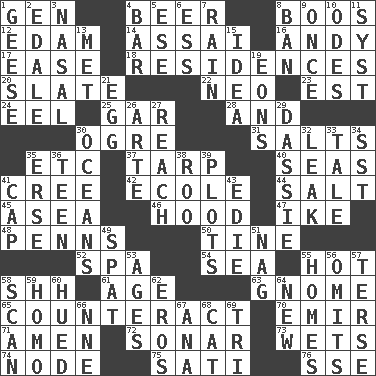 ACROSS 1. Commissioned mil. rank 4. Fermented drink made from hops 8. Expressions of contempt or scorn 12. Dutch treat 14. Slender Brazilian palm 16. "60 Minutes" Commentator Rooney 17. Relaxation 18. Dwellings 20. Schedule 22. Modern: prefix 23. Eastern Standard Time (abbr.) 24. Snakelike fish 25. Slender fish 28. Added to 30. Legendary monster 31. Table seasonings 35. And so on (abbr.) 37. Canvas cover 40. Oceans 41. Algonquian 42. Learning spot: Fr. 44. Table seasoning 45. Toward the sea 46. Parka part 47. D.D.E's nickname 48. Actor Sean's family 50. Prong on a fork 52. Health resort 54. Ocean 55. Being at a high temperature 58. Quiet! 61. Ripen 63. Dwarf 65. Frustrate 70. Arab leader 71. So be it 72. Echolocation 73. Soaks 74. Connecting point 75. Suttee (variant) 76. Compass dir. DOWN 1. Honkers 2. Peak District village in England 3. Relating to the nose 4. Tavern 5. Compass dir. 6. Curvy letter 7. Water falling in drops from the sky 8. Prohibit 9. At one time in the past 10. Lyric poems 11. System (abbr.) 13. Was introduced to 15. It may be bright or harebrained 19. Immeasurably long periods of time 21. Oval reproductive body of a fowl 26. Johnson of "Laugh-In" 27. Arrive at 29. Hyrax 30. Seas 32. Path through which fluid escapes 33. Falsehood 34. Fast jet (abbr.) 35. Celtic language 36. Adolescent 38. Friend of Pooh 39. Small pieces of grounds 41. Head covering 43. Singer Brickell 49. Argument over a trivial matter 51. Tired old horse 53. Matures 55. Residences 56. Leaves out 57. Laconic 58. Skim 59. Like (prefix) 60. Became colored 62. Greek god of love 64. ___ Haven, CT 66. Compass dir. 67. Santa ___, CA 68. Domesticated feline 69. Three (prefix)