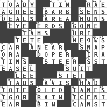 ACROSS 1. Sycophant 6. Metal container 9. Actress Charlotte 12. Match 13. Sharp remark 14. Elected reps. 15. Allots cards 16. Length times width 17. Religious women 18. Sight organ 19. Greek god of love 20. Went 21. Scottish caps 23. RI univ. 24. False hair 25. Catcalls? 28. Automobile 30. Approach 34. Fastener 35. Mouth or opening 36. Drug addict 38. Lyricist Gershwin 39. Metal containers 41. Guide 43. Fast jet (abbr.) 44. Artist's stand 46. Costume for a special activity 48. Area sheltered from the wind 49. Proofreading order 50. Small amounts or degrees 51. Advice 53. Possessed 56. Haul 57. Butter sub 58. Softens 60. Composer Stravinsky 61. Water falling in drops from the sky 62. Ancient Celtic tribe of eastern Britain 63. Hearing organ 64. Storage container 65. 2nd pers. sing. pres. of can (arch.) DOWN 1. Small boy 2. Double curve, resembling the letter S 3. Like ___ of sunshine 4. Erase 5. Consenting reply 6. Edible starchy tuberous root 7. Angers 8. Basketball assoc. 9. One who advocates reunion 10. Queen of England 1702-14 11. Double-curved letter 13. Drinking establishments 14. Sounds asleep 19. Make improvements or corrections to 20. Chewing product 22. "One Day ___ Time" 24. Interpreter 26. Armed conflicts 27. Petty quarrel 28. ____ d'Azur (French Riviera) 29. Operatic vocal solo 31. Greek goddess of the dawn 32. Fitting 33. To sift 37. Musical pauses 40. Sowing specialist 42. Regret 45. French article 47. New York city 49. The Jewish people; Israel 50. Ancient Roman robe 51. Mountain range southwest of Kyrgyzstan 52. Distinctive style or manner 54. So be it 55. Cub Scout units 56. Make a knot 57. Globe 58. Nervous spasm 59. Be seated