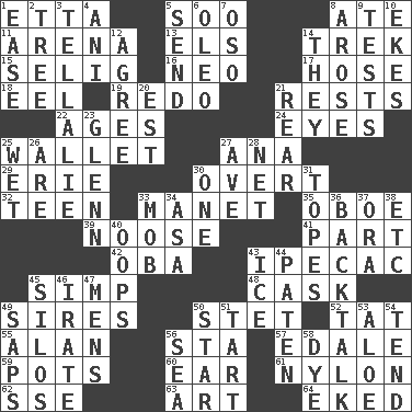 ACROSS 1. Singer James 5. "Barney Miller" actor Jack 8. Had dinner 11. Sports stadium 13. Raised railways 14. Long journey 15. Former Milwaukee Brewers owner Bud 16. Modern: prefix 17. Stockings 18. Snakelike fish 19. Do over again 21. Musical pauses 22. Matures 24. Snake ____ (dice throw) 25. Place for singles 27. Santa ___, CA 29. One of the Great Lakes 30. Unconcealed 32. Adolescent 33. French painter Edouard 35. Mitch Miller's instrument 39. Trap for birds or small mammals 41. Piece 42. Chief or king in Benin or Nigeria 43. Medicinal drug used to evoke vomiting 45. Simple or foolish person 48. Keg 49. Fathers 50. Proofreading order 52. Make lace 55. Actor Alda or Thicke 56. R.R. building 57. Peak District village in England 59. Plant holders 60. Ewer handle 61. High-strength synthetic material 62. Compass dir. 63. Nonscientific branch of learning 64. Made supply last DOWN 1. Relaxation 2. Family _ (genealogy) 3. Copy Pinocchio 4. Black tropical American cuckoo 5. Transmit 6. Margarine 7. Bear (Spanish) 8. Came up 9. Trials 10. Supplements with great effort 12. Match 14. Those people 20. Eastern Standard Time (abbr.) 21. Hitchcock's "____ Window" 23. American astronaut and politician John 25. Soggy 26. "We ___ not amused" (Victoria) 27. "___ Maria" 28. Fish or hair follower 30. Single 31. Drinks excessively 33. Crowd into 34. White ___ sheet 36. Sass 37. Mouth or opening 38. And so on (abbr.) 40. I made a mistake 43. Frozen water 44. Eucharist need 45. Grain storage towers 46. Feeling or showing extreme anger 47. Not women's 49. Plant excrements 50. Play the lead 51. Small pie 53. Medicinal plant 54. Be inclined (to) 56. Ocean 58. Color