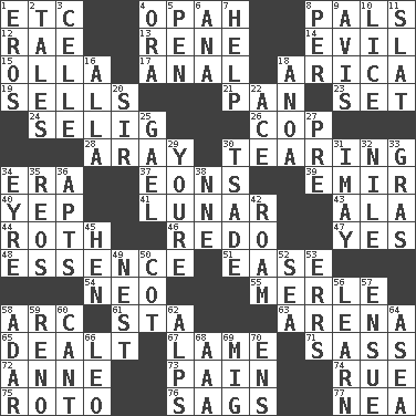 ACROSS 1. And so on (abbr.) 4. Brightly colored fish 8. Friends 12. Actress Charlotte 13. French philosopher Descartes 14. Tending to cause great harm 15. Water jar 17. Of or related to the anus 18. N. Chile seaport 19. Makes a sale 21. Baking dish 23. Arrange properly for use 24. Former Milwaukee Brewers owner Bud 26. Police officer (slang) 28. Like ___ of sunshine 30. Lacerating 34. Epoch 37. Immeasurably long periods of time 39. Independent ruler or chieftain 40. Slangy assent 41. Type of eclipse 43. Insect wing 44. Writer of Portnoy's Complaint (1969) 46. Redecorate 47. Affirmative reply 48. Center 51. Comfort 54. Modern: prefix 55. Haggard of country music 58. Curve 61. R.R. building 63. Sports stadium 65. Started a card game 67. Unable to walk 71. Backtalk 72. Singer Murray 73. Ache 74. Sorrow 75. Printing process, for short 76. Sinks 77. Teachers' org. DOWN 1. Greek god of love 2. Lies 3. Cell (Danish) 4. Mouth or opening 5. Fenced enclosure 6. Santa ___, CA 7. Aid 8. For each 9. Deliberation 10. Louse (plural) 11. Narrow board 16. Silent film actress Nazimova 18. Small Philippine buffalo 20. Title for a knight 22. Adept person 25. Highlander 27. Before (prefix) 29. You are 30. Sadhe (variant) 31. "If ____ say so..." 32. Mediterranean tributary 33. Pate de foie ____ 34. Jane of fiction 35. Vintage cars 36. Flats, for short 38. Compass dir. 42. Wander aimlessly 45. Layer 49. Egg locale 50. Small bed 52. Ocean 53. Blunders 56. Acquire or gain knowledge or skills 57. Take place subsequently 58. The sixth month of the Jewish calendar 59. Former U.S. Attorney General Janet 60. Patter 62. High mountains 64. At sea 66. Lion 68. American Automobile Association (abbr.) 69. Russian fighter aircraft 70. Followers of ems